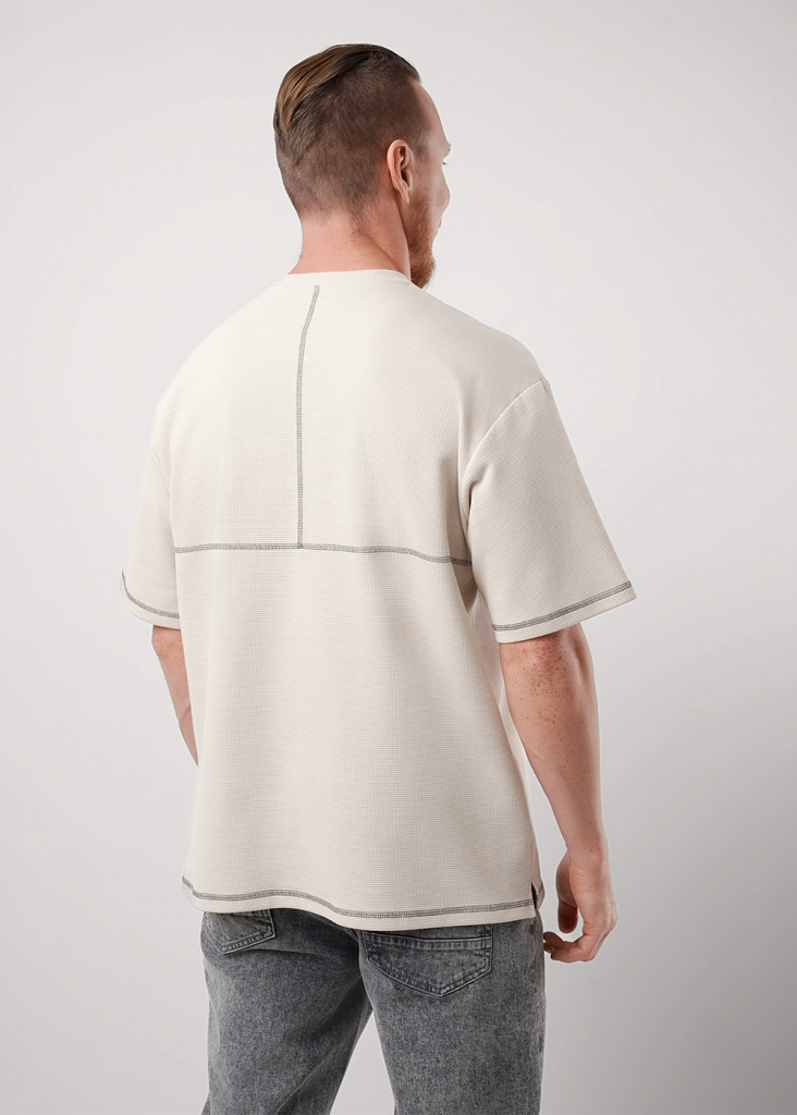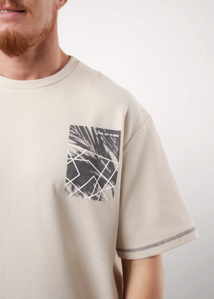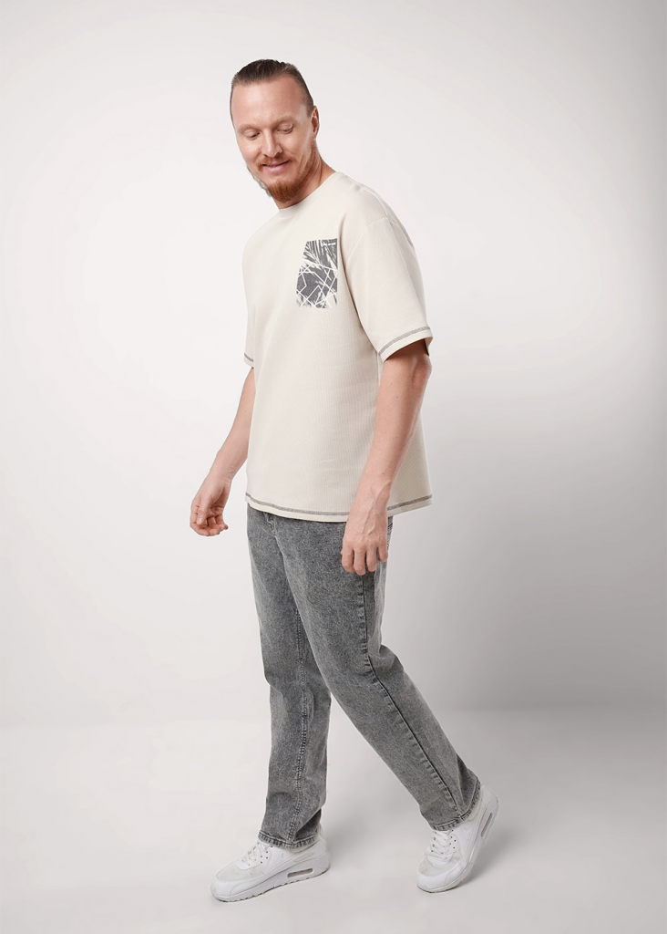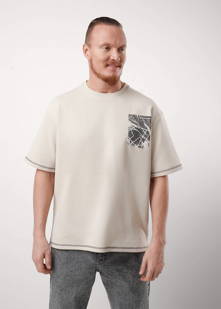 Футболка свободного кроя с круглым вырезом горловины и коротким рукавом. Модель выполнена из фактурного трикотажного полотна. Акцент изделия- дизайнерский принт и контрастные отделочные строчки. Универсальная вещь мужского гардероба на каждый день.