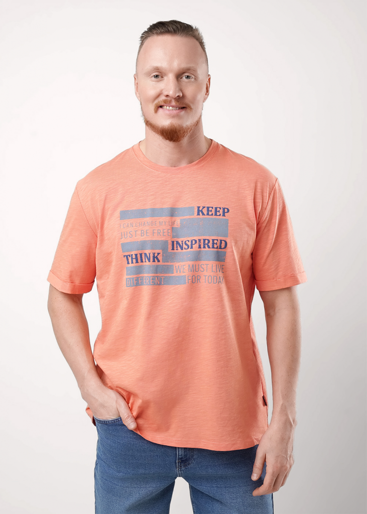 Футболка мужская с круглым вырезом горловины и коротким втачным рукавом из фактурного полотна флам. Футболку дополняет шрифтовой принт. Подойдет для прогулок и встреч с друзьями.