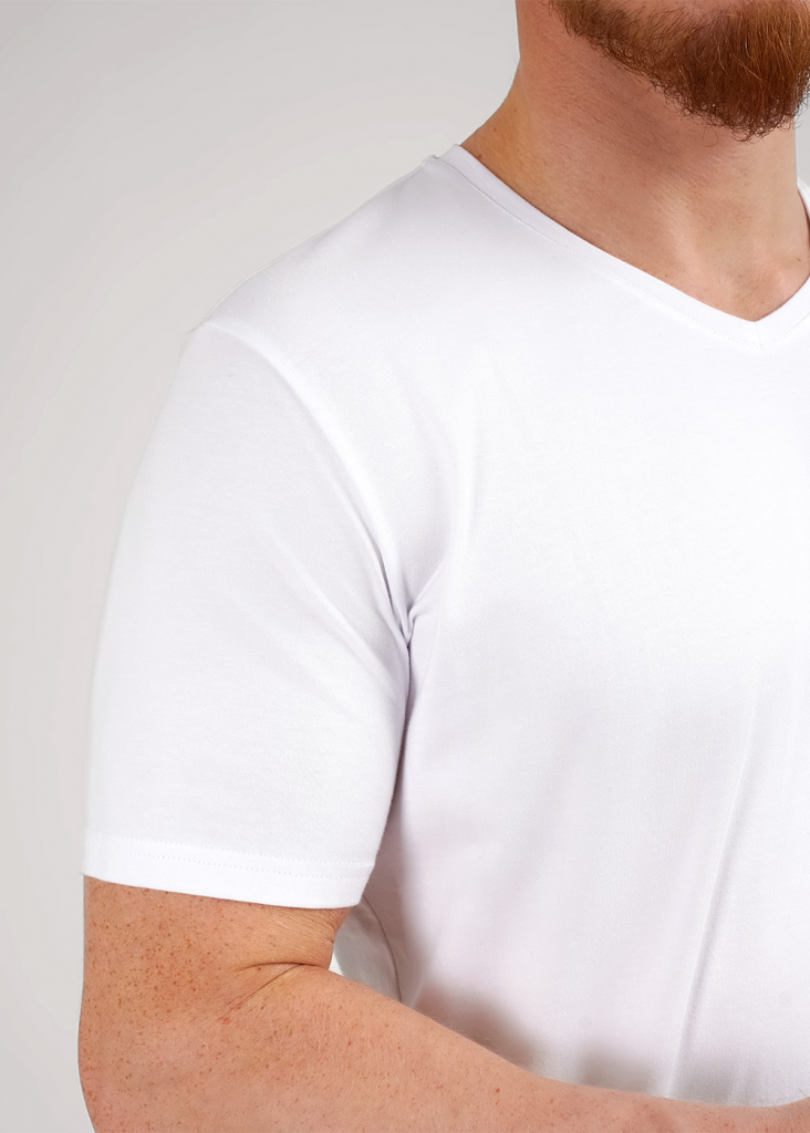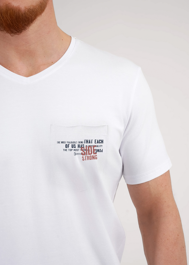 Мужская футболка с V-образной горловиной , втачным рукавом из хлопкового полотна с добавлением эластана. Особенность модели- карман с необработанным краем и дизайнерским принтом. Данная футболка является отличным дополнением к брюкам или джинсам.