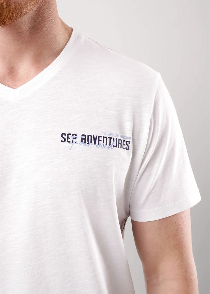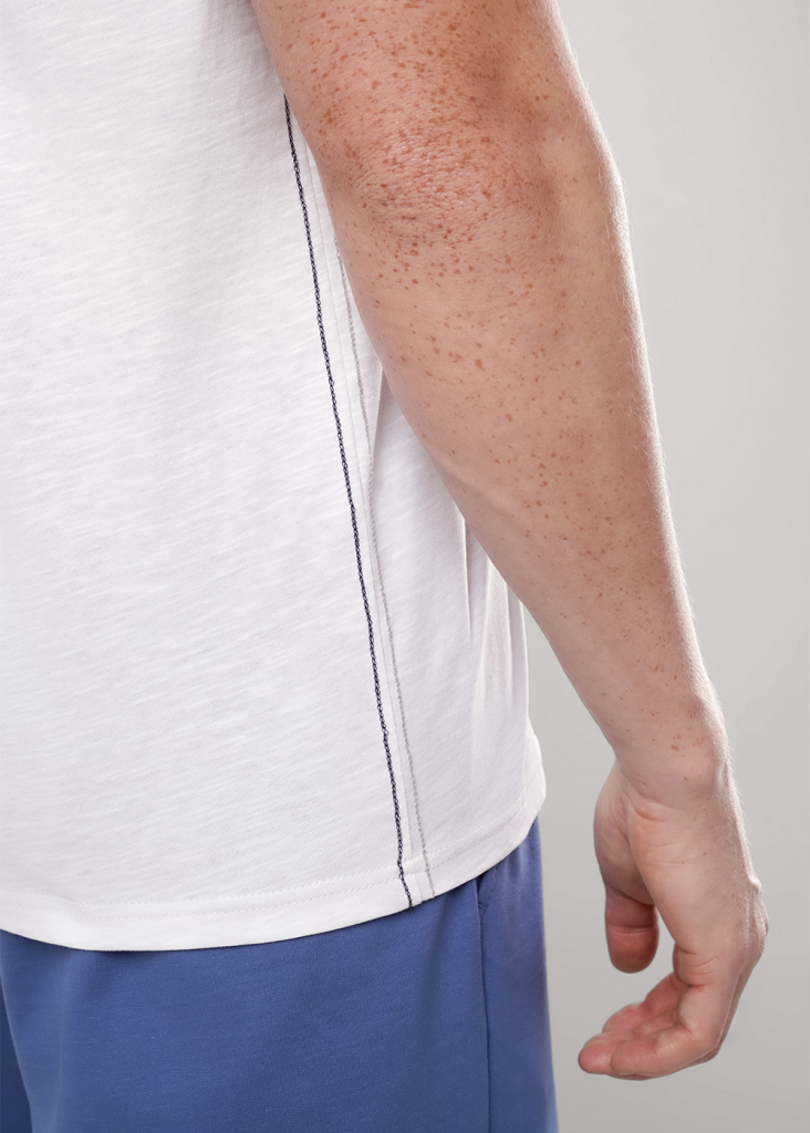 Футболка мужская с V-образным вырезом горловины и коротким втачным рукавом из фактурного полотна "флам". Данная модель дополнена контрастными отделочными строчками по боковым швам и шрифтовыми принтами. Можно сочетать с брюками или шортами.