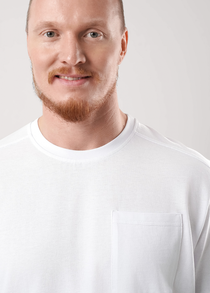 Футболка мужская с круглым вырезом горловины из хлопкового фактурного полотна "вафля". Футболку дополняет карман по груди и боковые разрезы. Отлично подойдет для прогулок и встреч с друзьями.