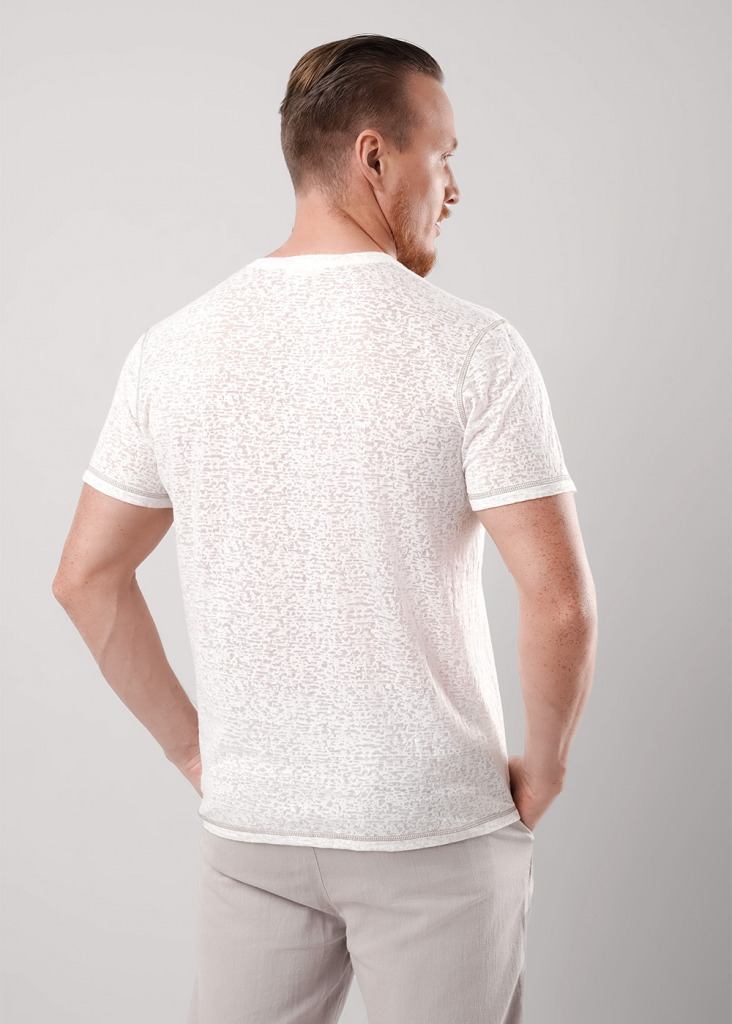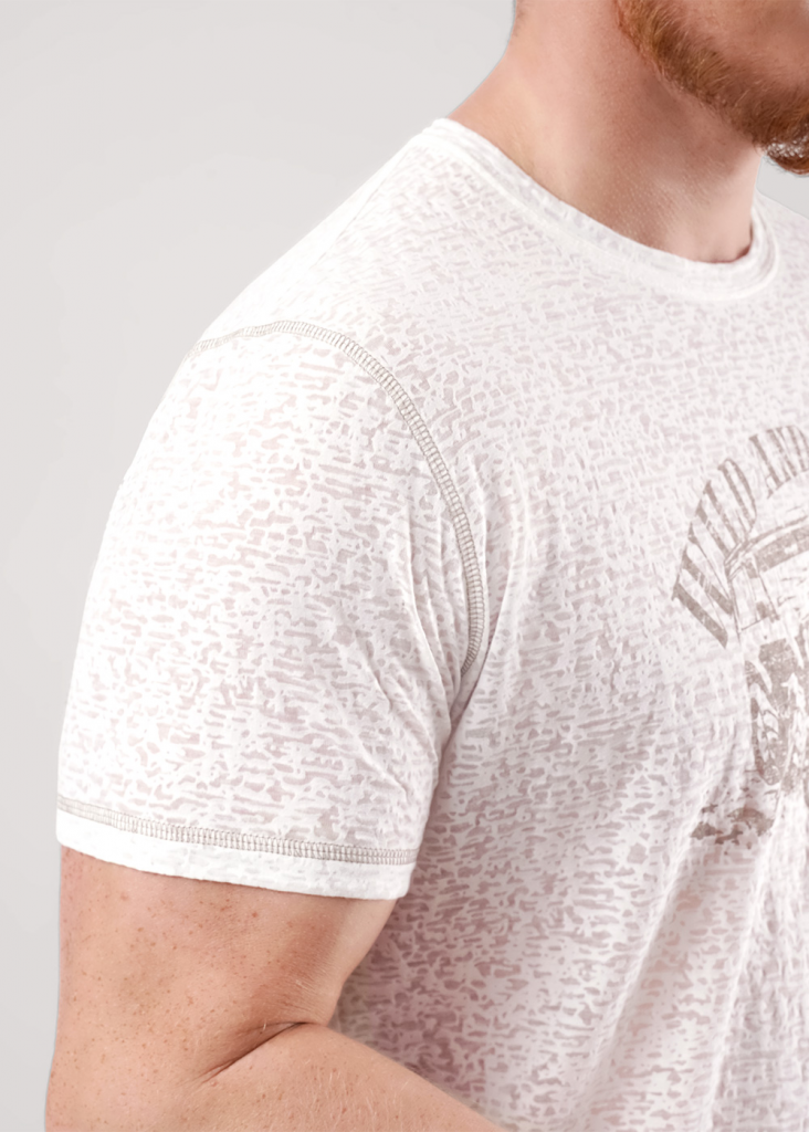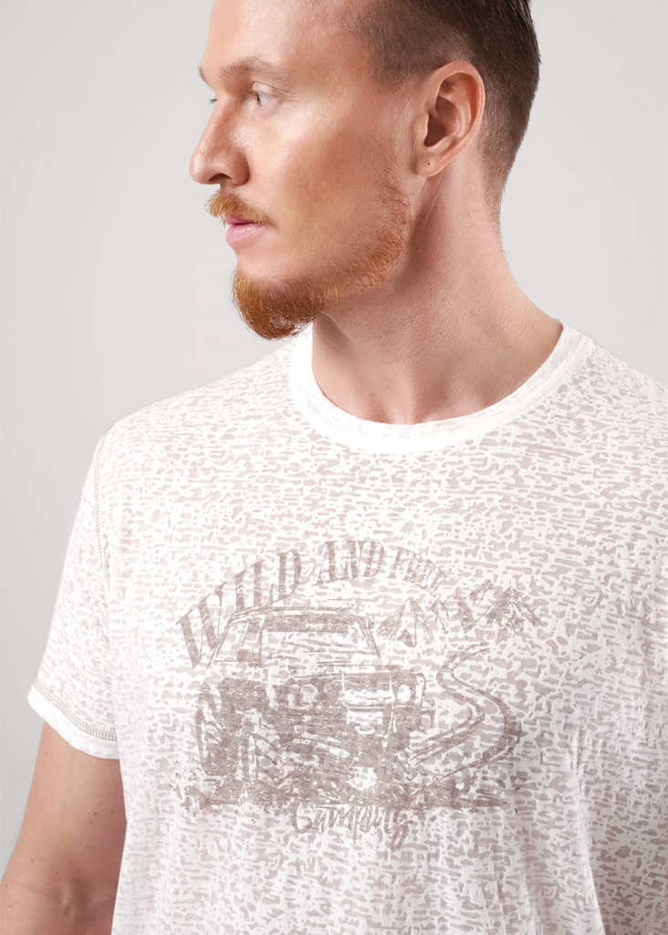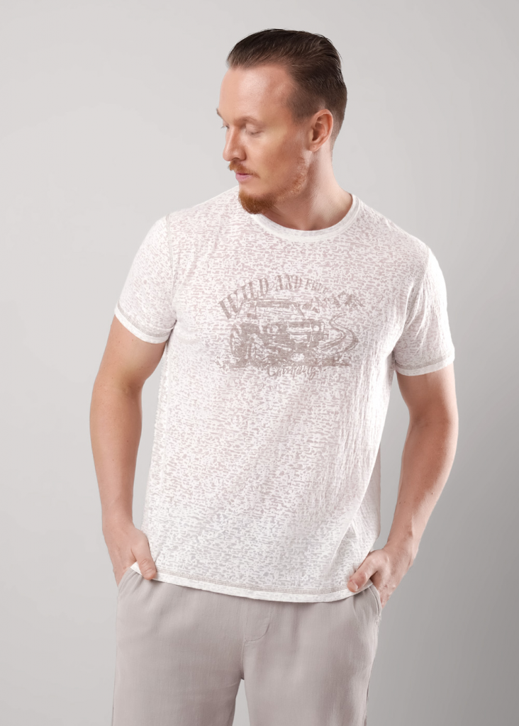 Футболка с груглой горловиной из трикотажного полотна с эффектом "деворе". Данная модель дополнена отделочными строчками и дизайнерским принтом. Можно сочетать с брюками или шортами.