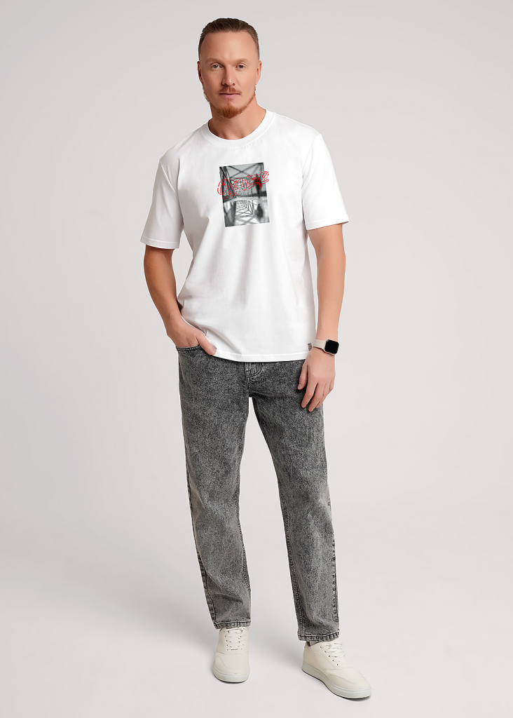 Футболка свободного кроя с круглым вырезом горловины и коротким рукавом. Модель выполнена из трикотажного хлопкового полотна. Изделие дополнено дизайнерским принтом и имиджевой фурнитурой. Универсальная вещь мужского гардероба на каждый день.