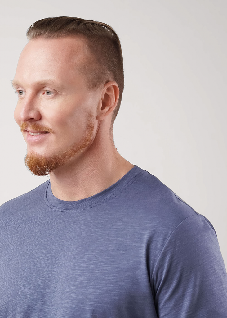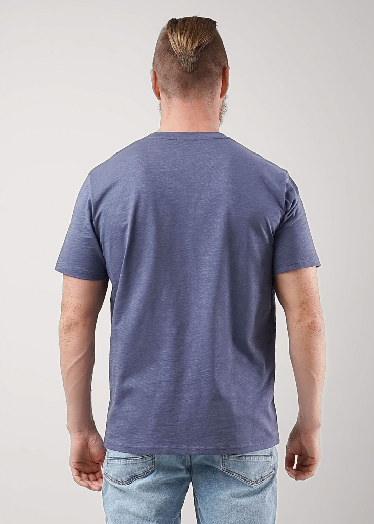 Футболка мужская с округлой горловиной и коротким втачным рукавом из фактурного полотна "флам". Изделие дополнено имиджевым принтом в цвет полотна. Данная модель прекрасно комбинируется с джинсами или шортами благодаря своей универсальности.