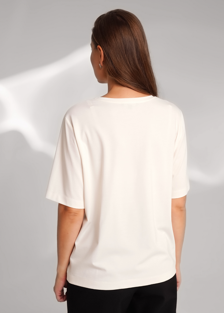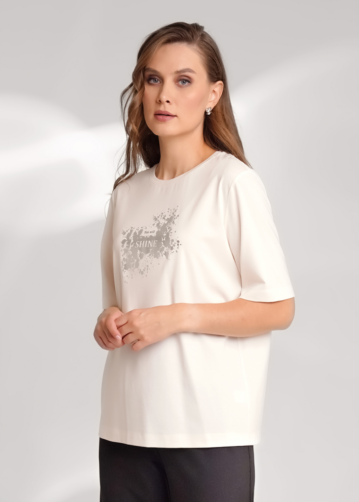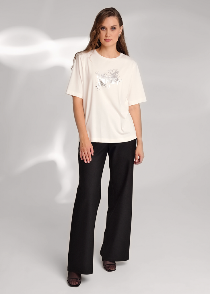 Футболка прямого кроя из поливискозного трикотажного полотна интерлок. Короткий втачной рукав. Округлая горловина с обтачкой. Спереди термопайетки.