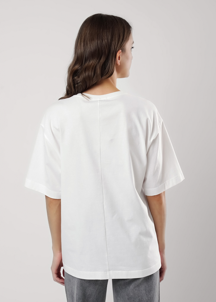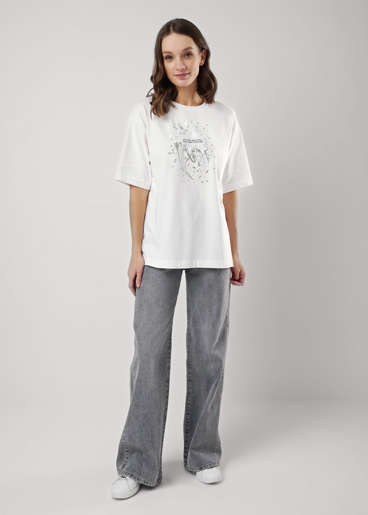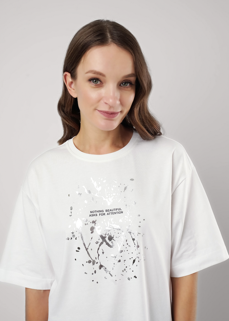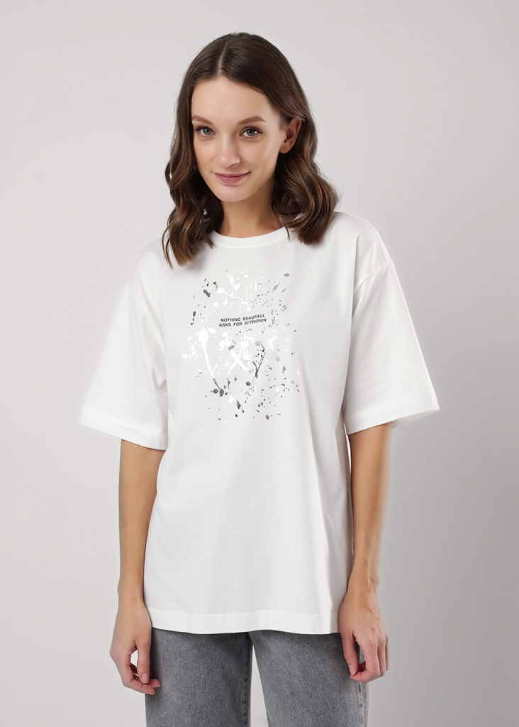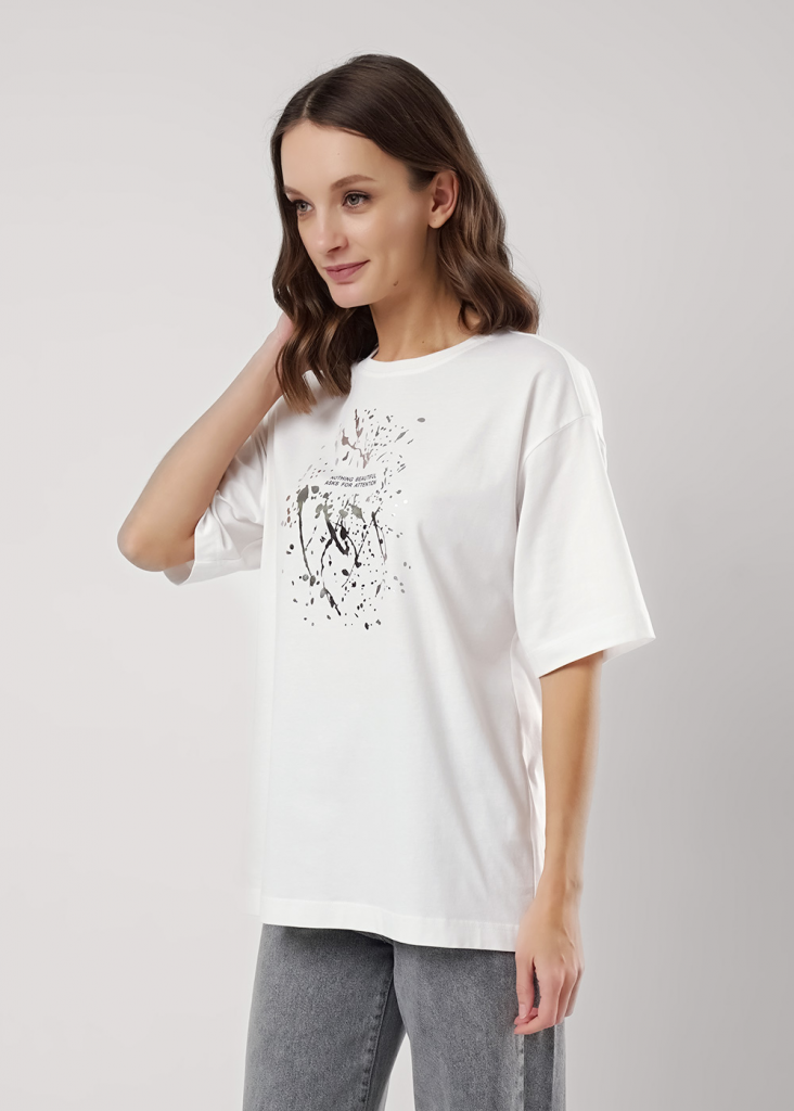 Футболка оверсайз свободного кроя из хлопкового трикотажного полотна. Слегка спущенный короткий рукав. Округлая горловина с обтачкой из рибаны. По спинке средний шов. Спереди принт с фольгой.
