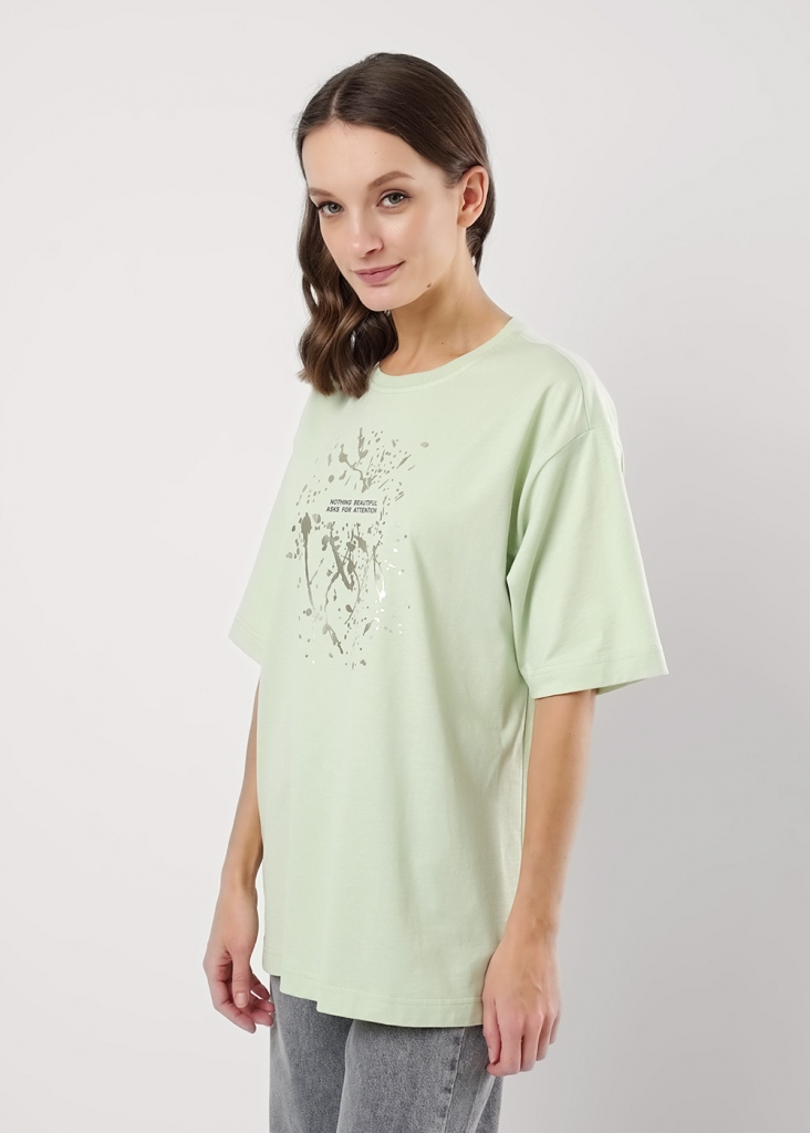 Футболка оверсайз свободного кроя из хлопкового трикотажного полотна. Слегка спущенный короткий рукав. Округлая горловина с обтачкой из рибаны. По спинке средний шов. Спереди принт с фольгой.