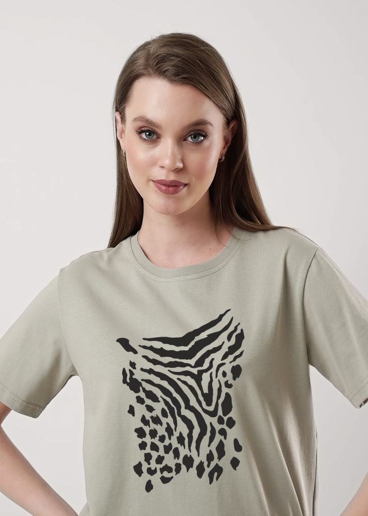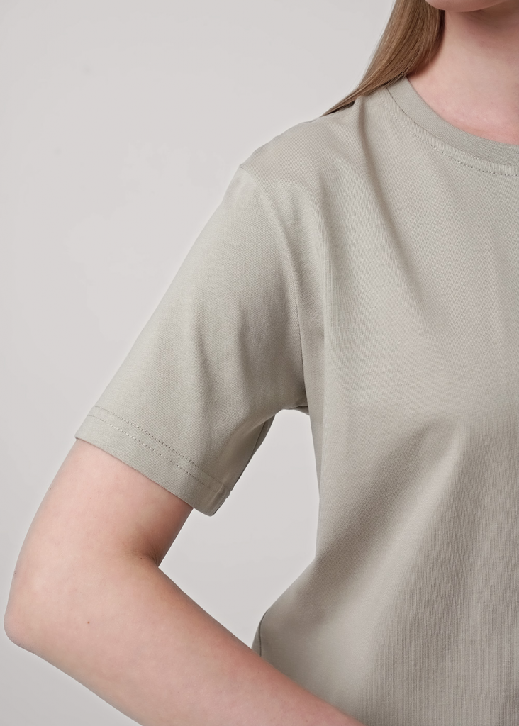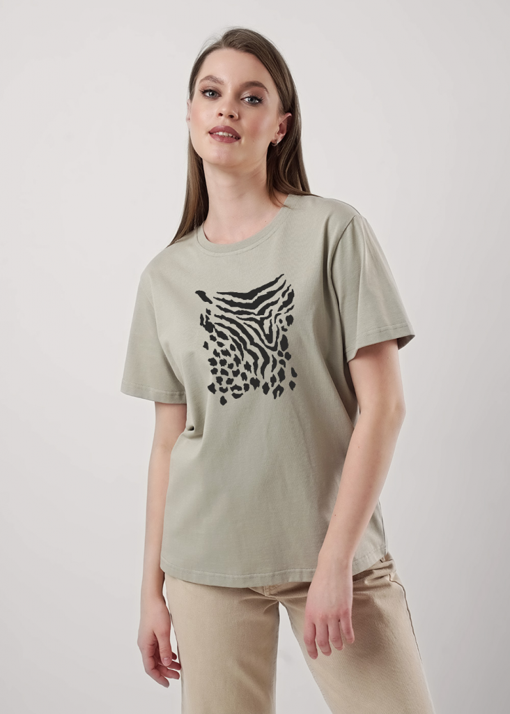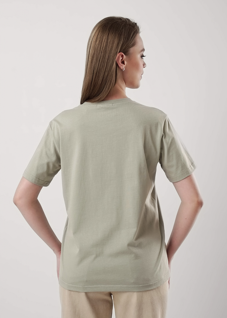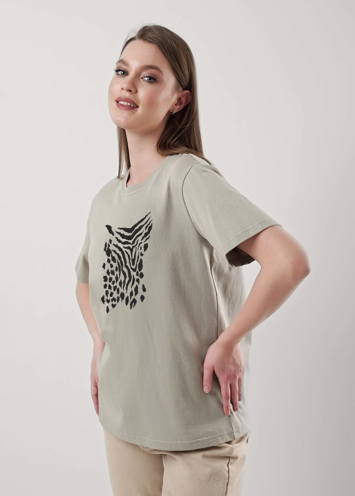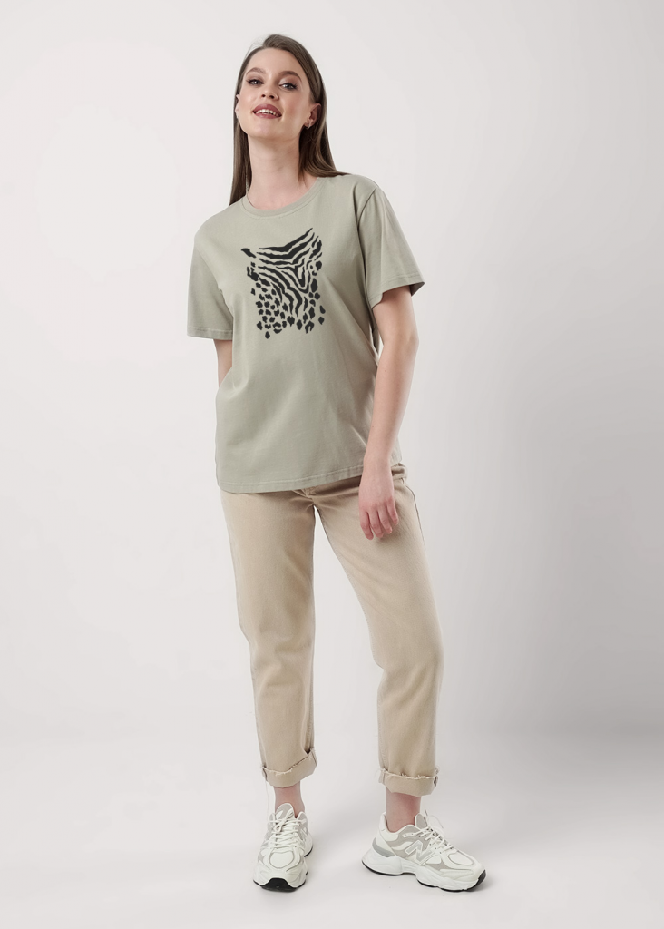 Футболка классического кроя из плотного хлопкового трикотажного полотна. Короткий втачной рукав. Округлая горловина с обтачкой из рибаны. По переду принт с фольгой