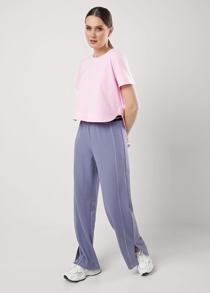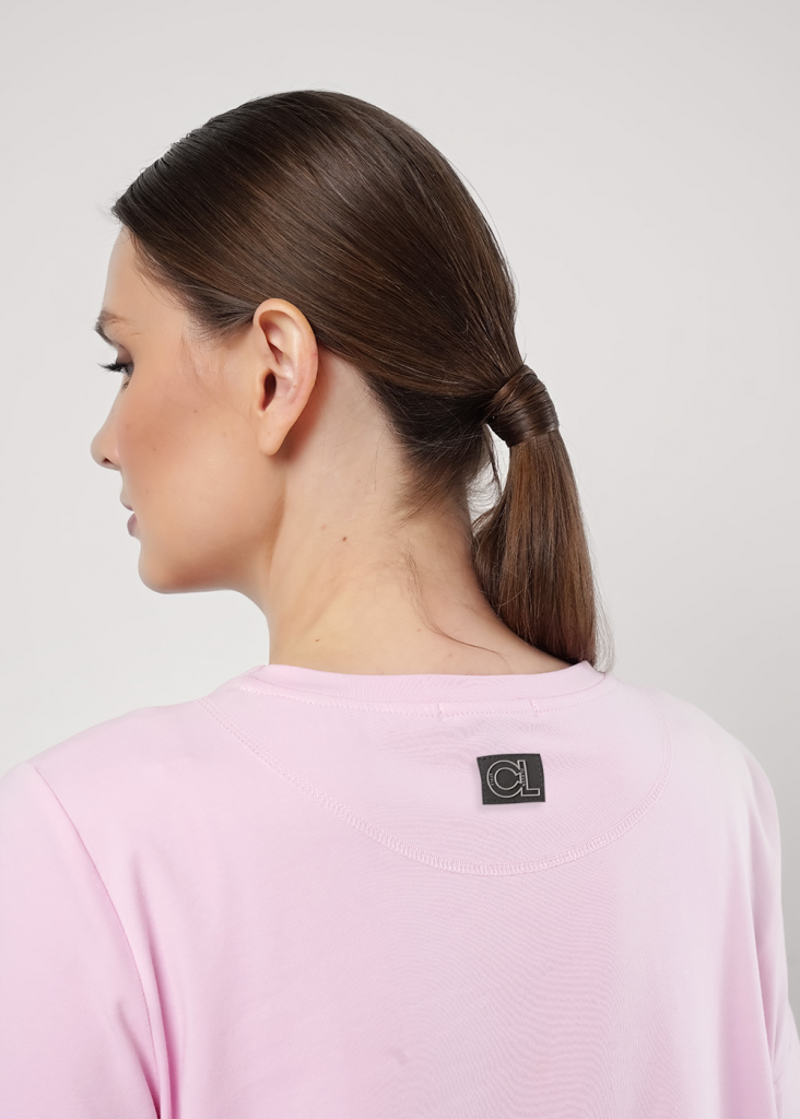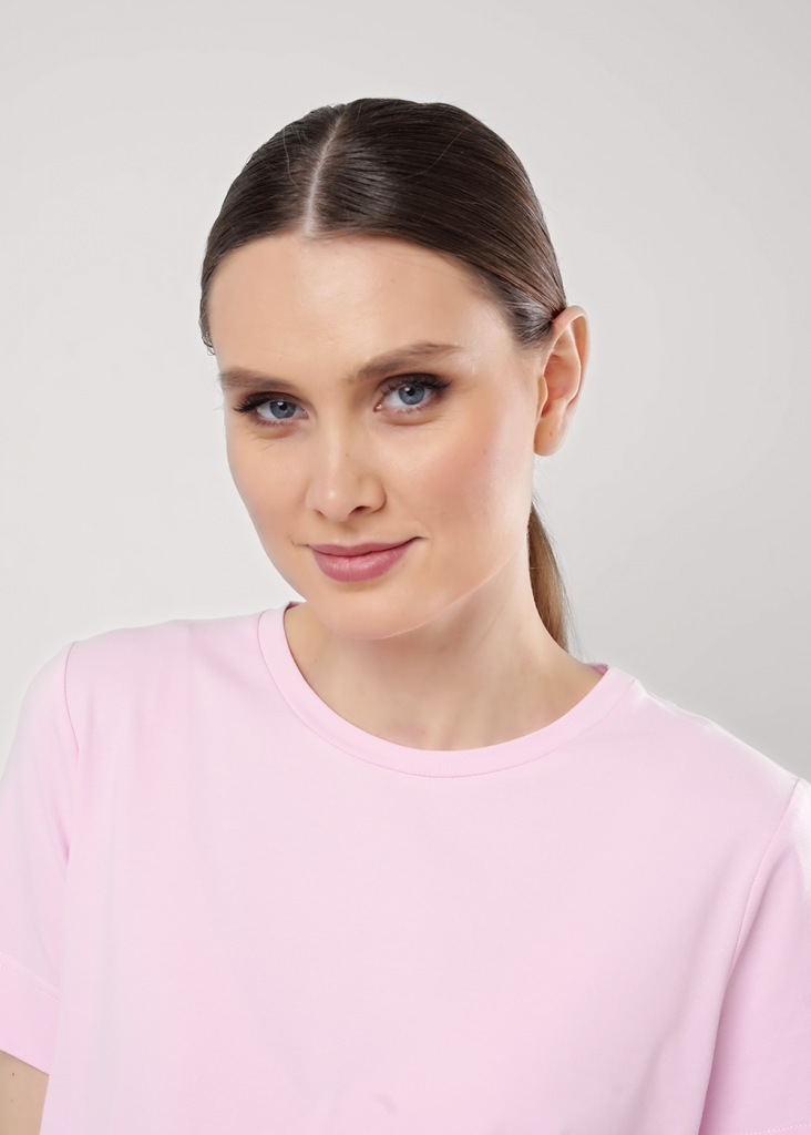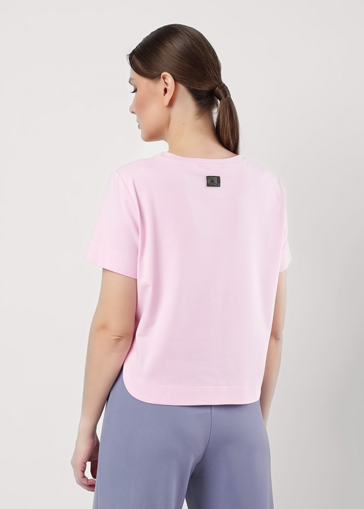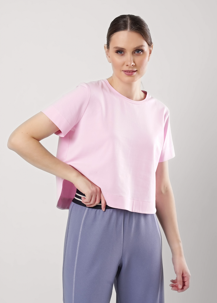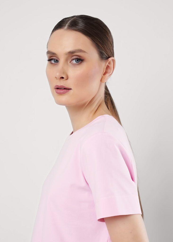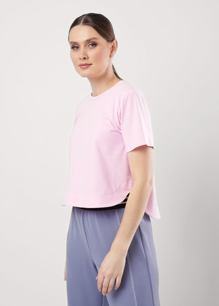 Футболка из хлопкового трикотажного полотна с эластаном. Короткий втачной рукав. Округлая горловина с обтачкой. Ассиметричный-фигурный низ. По спинке внутренняя кокетка с застилом, нашивка.