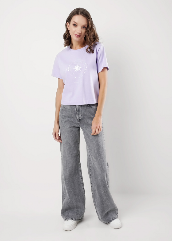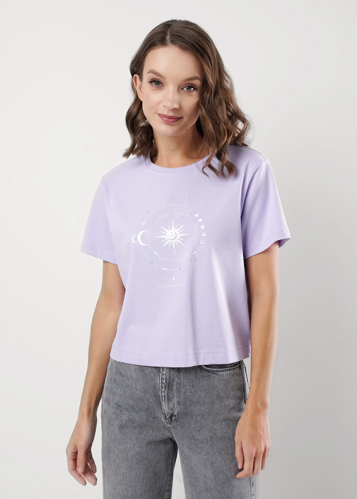 Футболка укороченная из хлопкового трикотажного полотна. Короткий втачной рукав. Округлый вырез горловины с обтачкой из рибаны. По переду принт с шиммером.