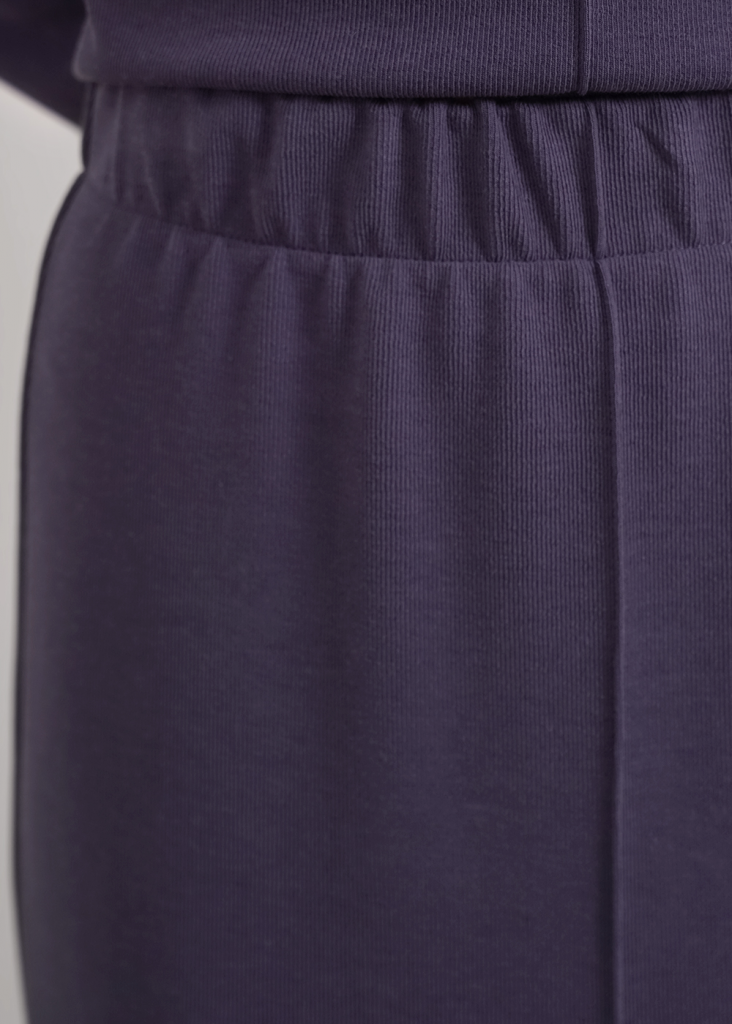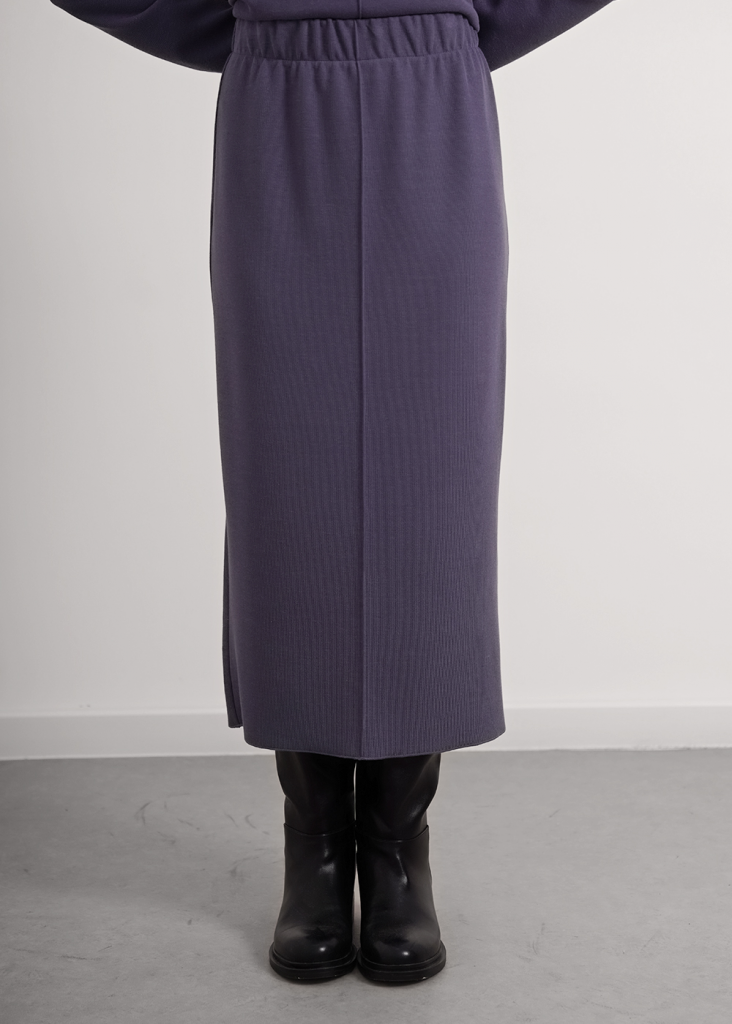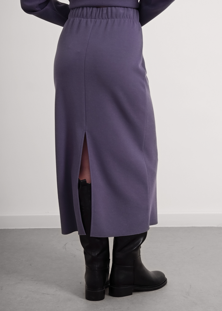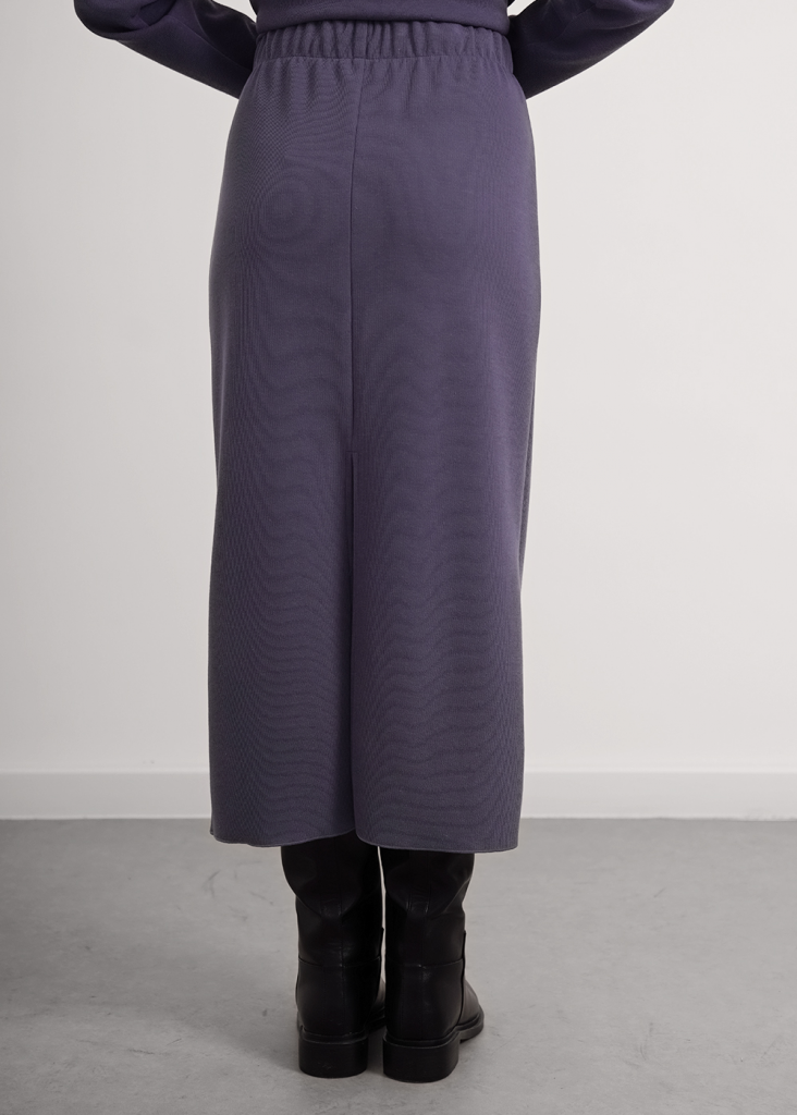Юбка миди из трикотажного полотна силаник, прямого кроя. По талии цельнокроенный пояс с внутренней резинкой. По переду вертикальный защип, по спинке средний шов внизу разрез. По низу изделия мелкий оверлок.