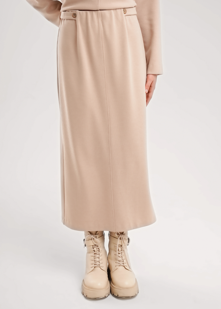 Юбка прямого кроя из трикотажного поливискозного полотна джерси длиной миди. Спереди средний шов, по спинке средний шов с молнией и разрезом. По талии потайная обтачка на резинке, боковые хлястики с пуговицей. По низу изделия потайной стежок.