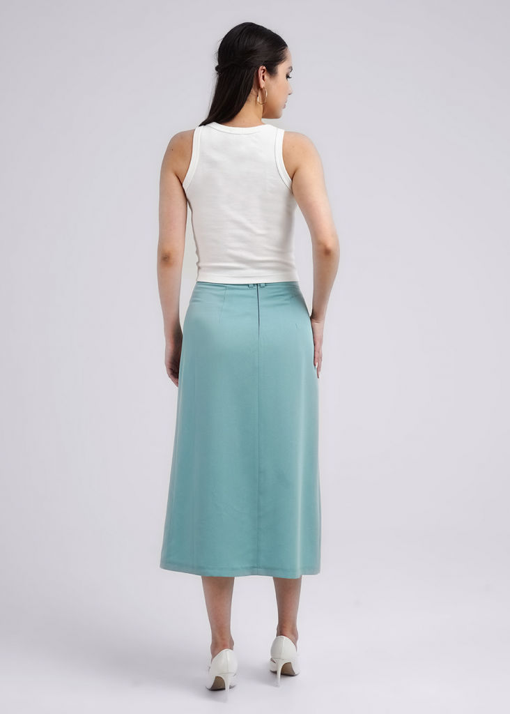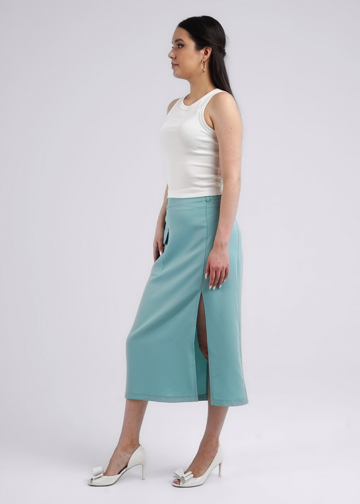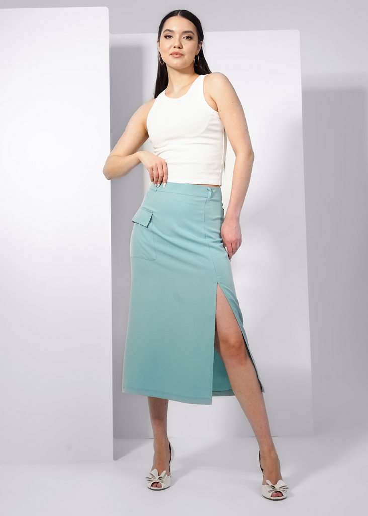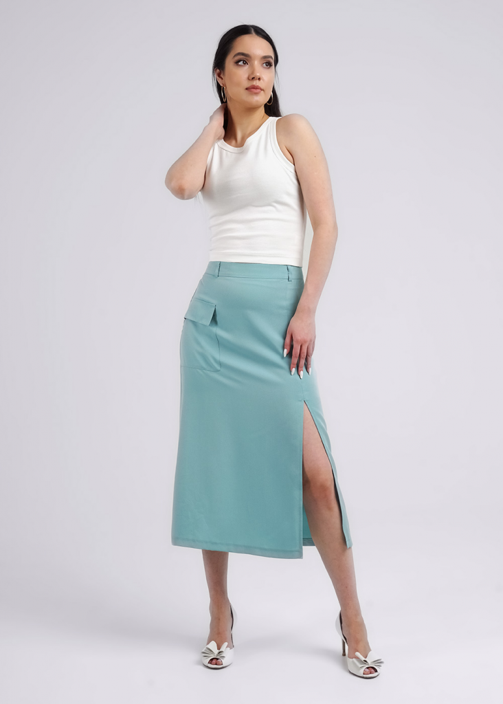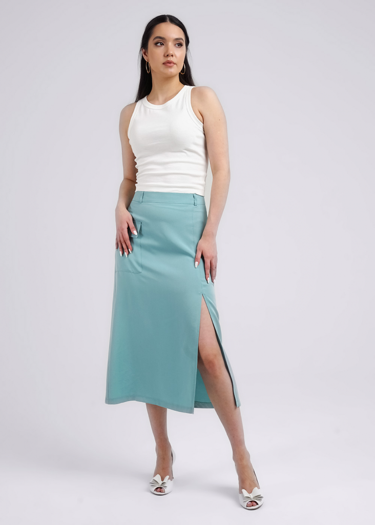 Юбка миди из текстильного полотна штапель. По талии притачной пояс со шлевками. По переду боковой разрез, справа накладной карман с клапаном. По спинке средний шов с застежкой на молнию, вытачки.