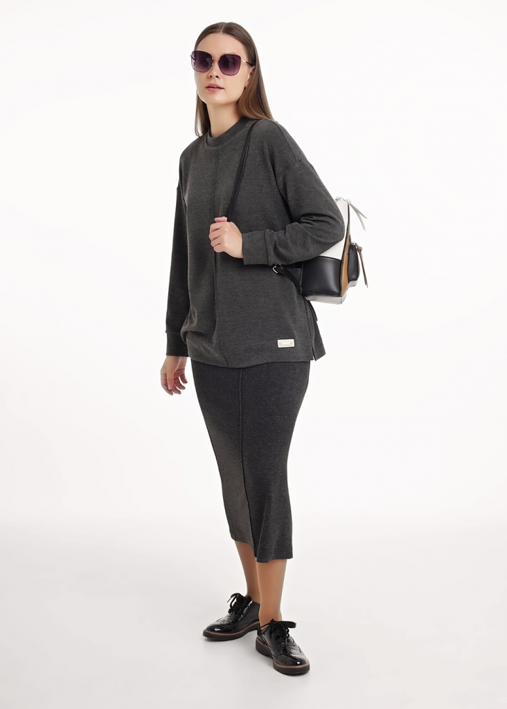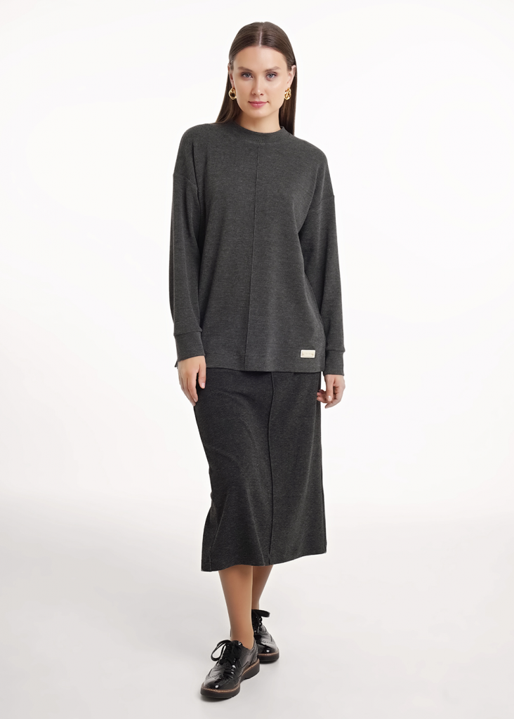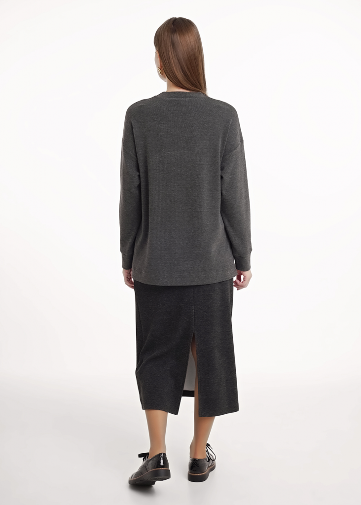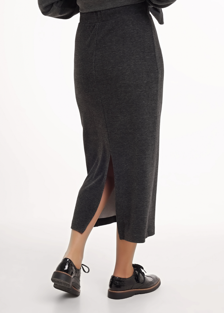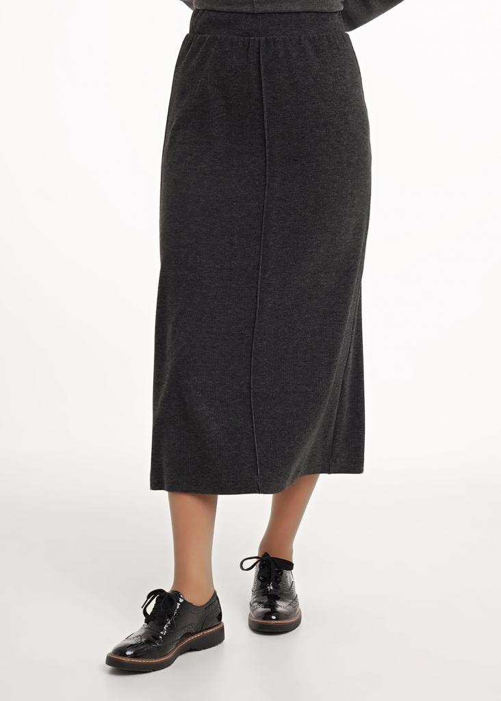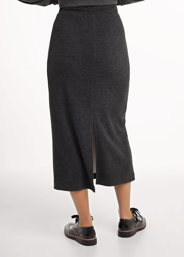 Юбка миди прямого силуэта из трикотажного полотна рибана с вискозой. По талии притачной пояс на внутренней резинке. На детали переда вертикальный защип. На спинке средний шов, внизу разрез.