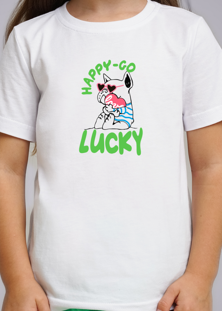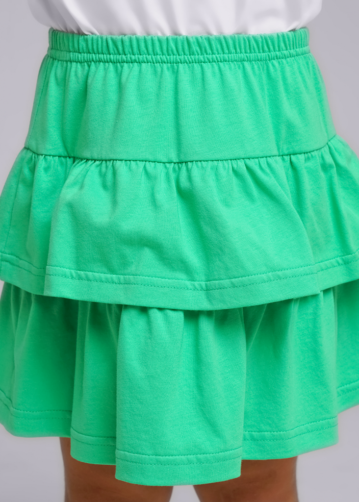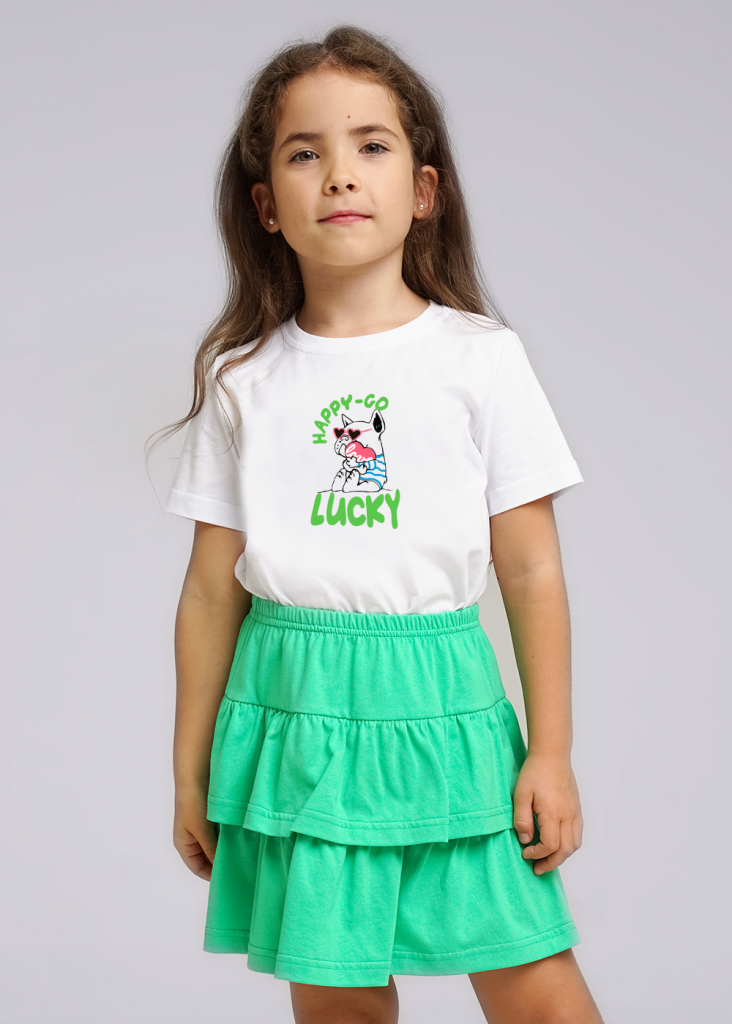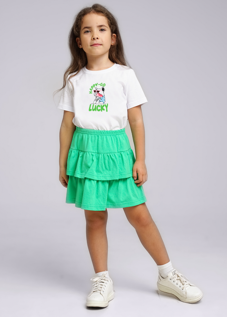 Хлопковый костюм для девочки: базовая футболка с втачным рукавом, украшенная ярким принтом по переду и двухъярусная юбка на резинке.
