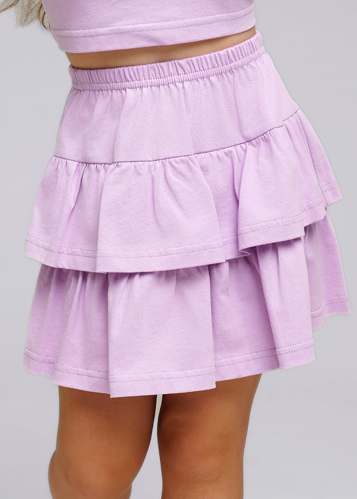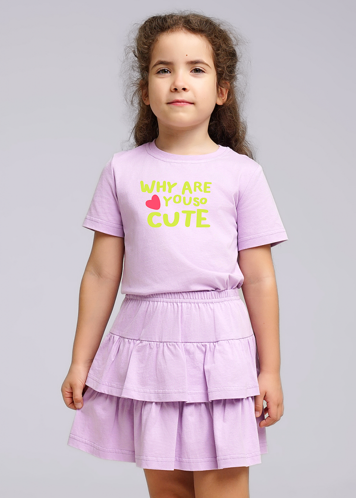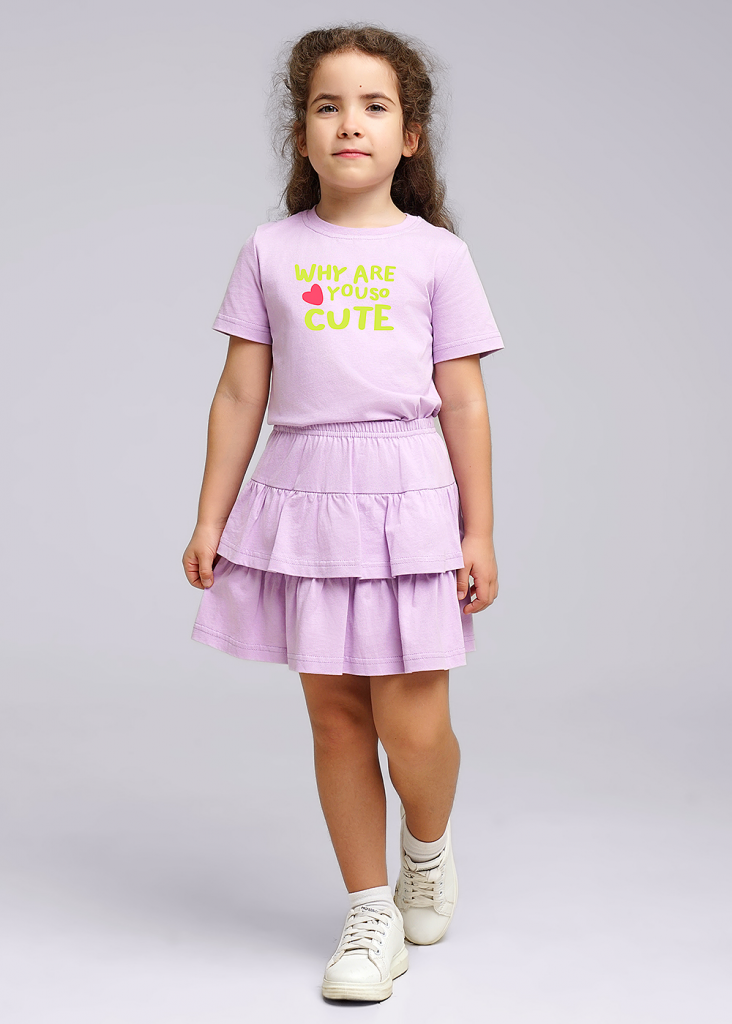 Хлопковый костюм для девочки: базовая футболка с втачным рукавом, украшенная ярким принтом по переду и двухъярусная юбка на резинке.
