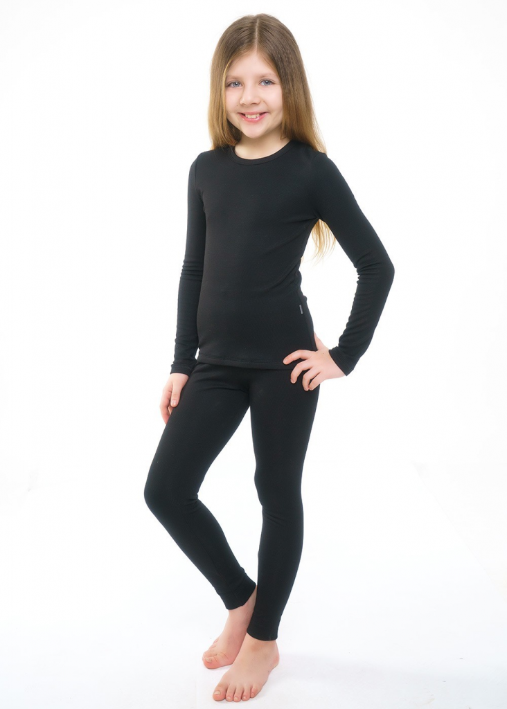Термокомплект из плотного трикотажного полотна с хорошей гигроскопичностью, двухпредметный: лосины, плотнооблегающие ногу, и джемпер небольшого объема. Комплект украшен каучуковой нашивкой по низу джемпера. Удобен в холодное время года.