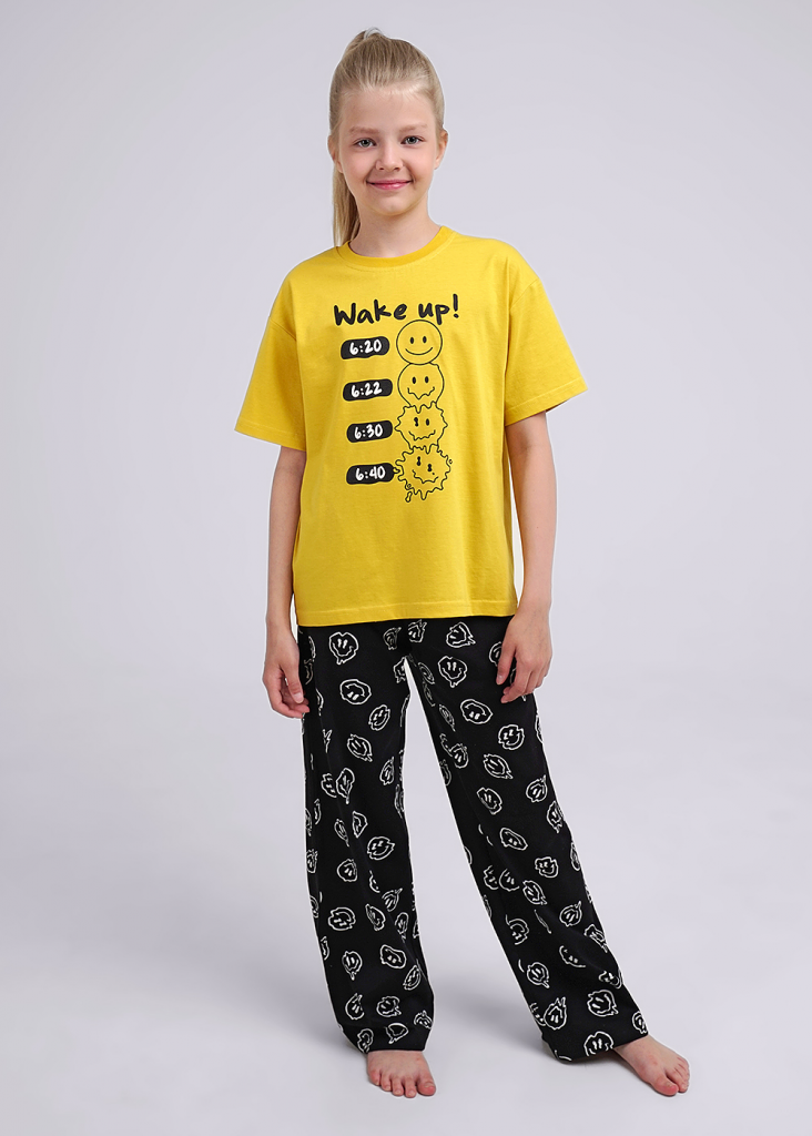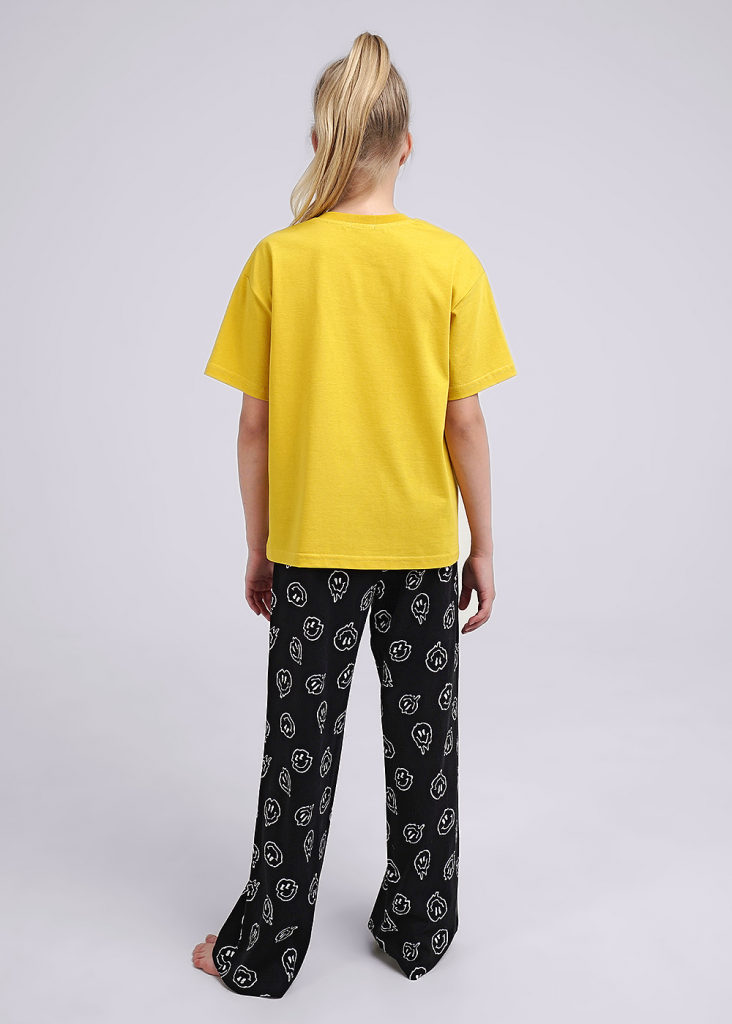 Вау! Стильная хлопковая пижама, как у мамы! Футболка среднего обьёма с милым принтом по переду. Широкие прямые брюки с трендовыми набивками. Резинка по поясу для комфортной посадки.