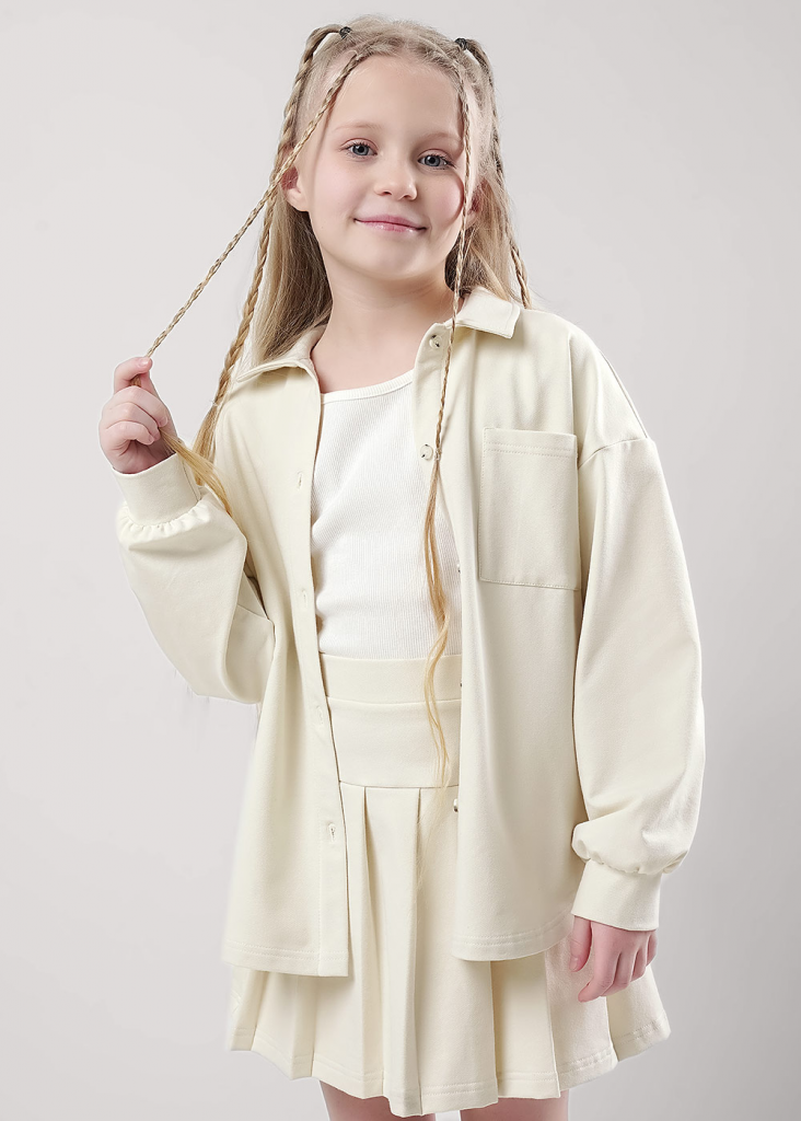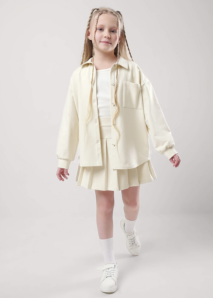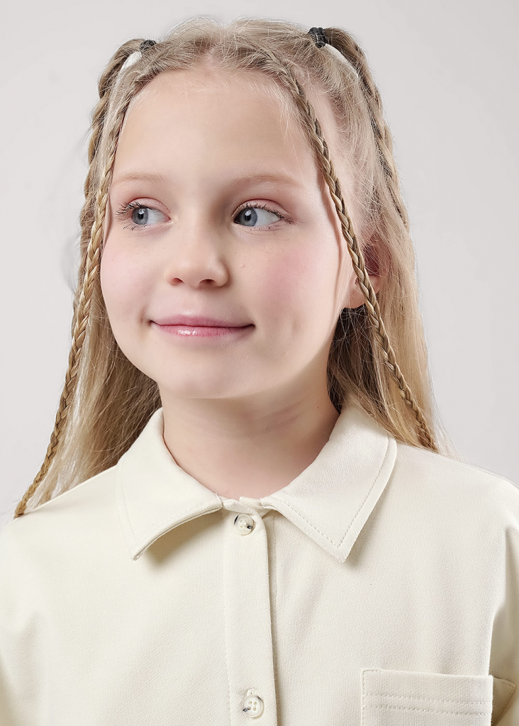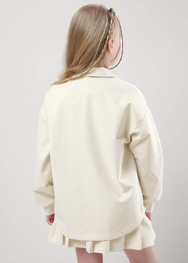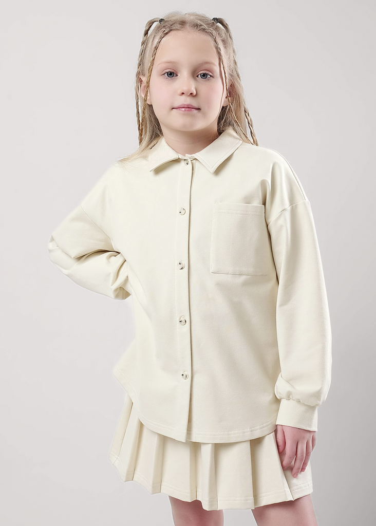 Стильная рубашка из трикотажного полотна станет отличным дополнением к твоему гардеробу. Лаконичная модель выполнена в приятном кремовом оттенке. Сочетай рубашку с брюками или юбкой из новой коллекции и получишь много новых классных образов!