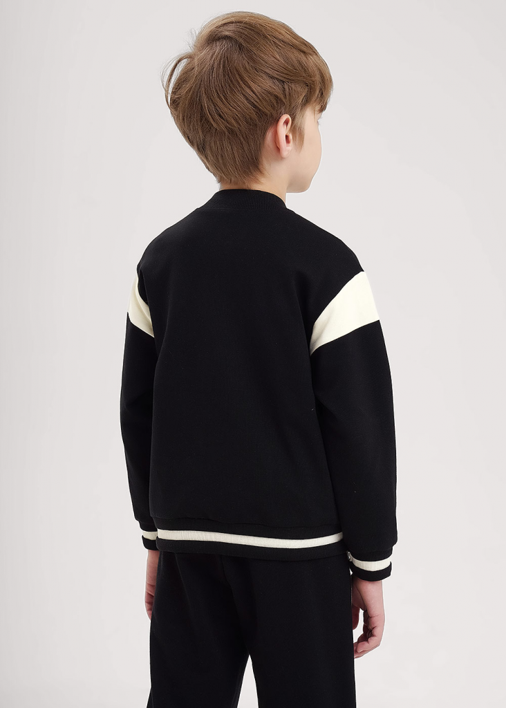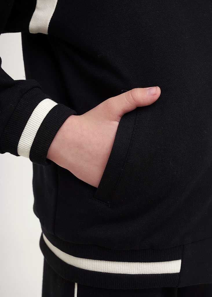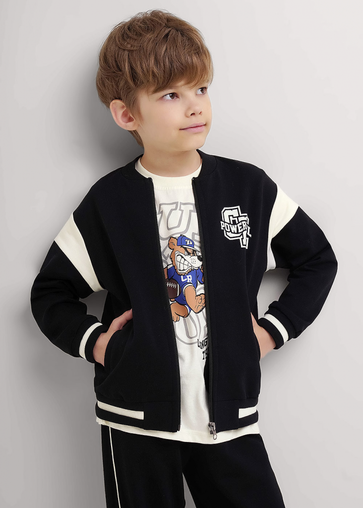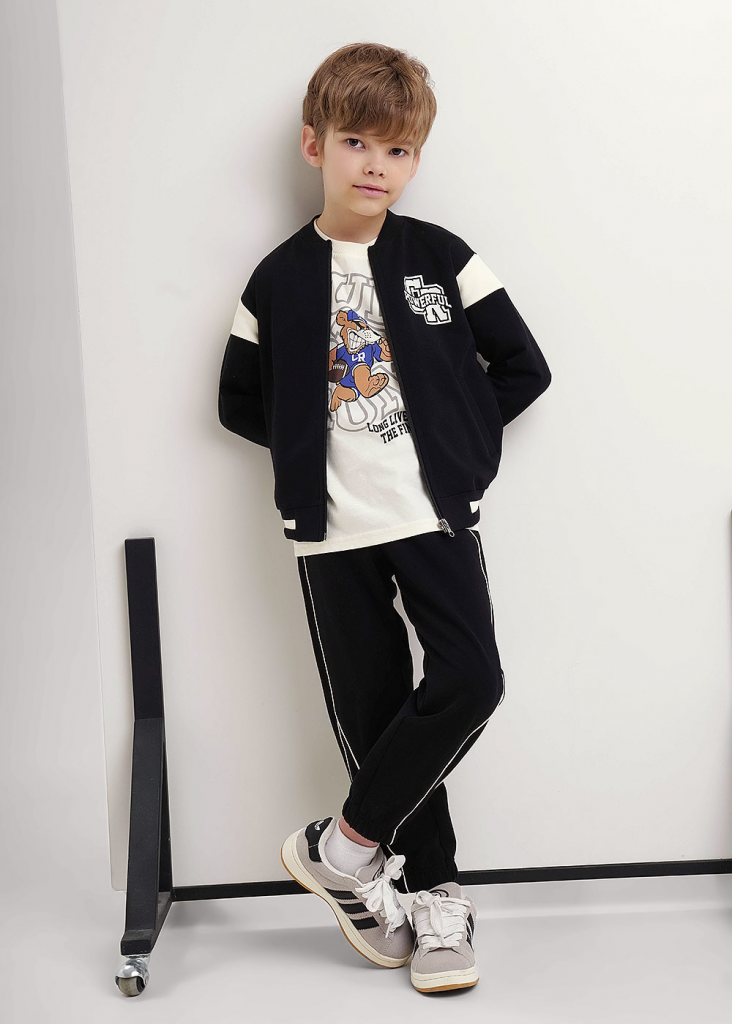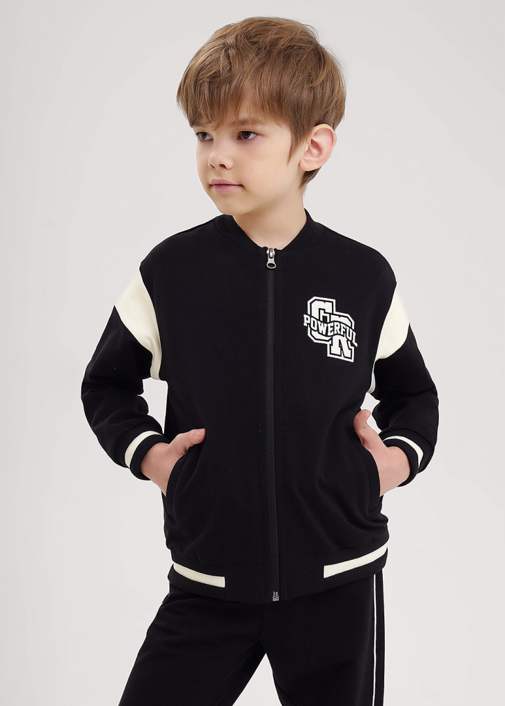 Стильный бомбер из мягкого футера отлично подойдёт для активных игр и повседневных образов. Контрастная отделка по низу модели и манжетам, декоративные вставки на плечах, функциональные карманы. Сочетай бомбер с брюками из новой коллеции и будь в тренде!