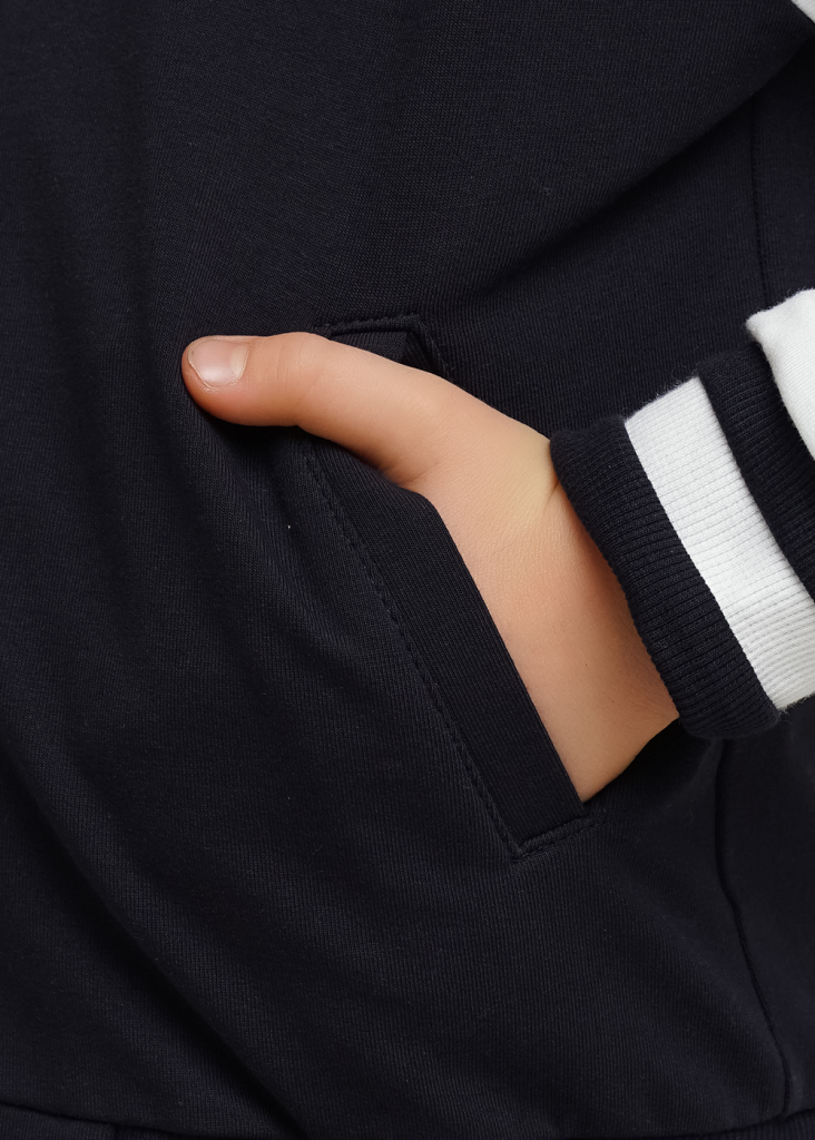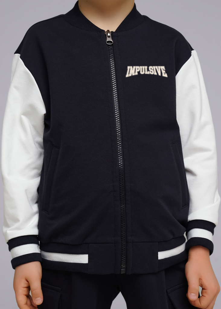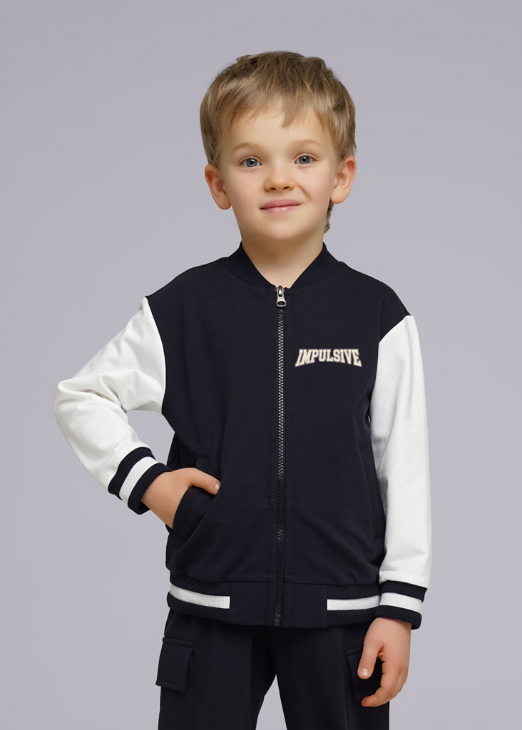 Бомбер на молнии для твоих стильных образов! Выполнен из футера: приятный материал, сохраняет тепло. Низ и манжеты из эластичного кашкорсе. Спереди принт. Дополни бомбер яркой футболкой и брюками-трансформерами из коллекции - крутой аутфит готов!