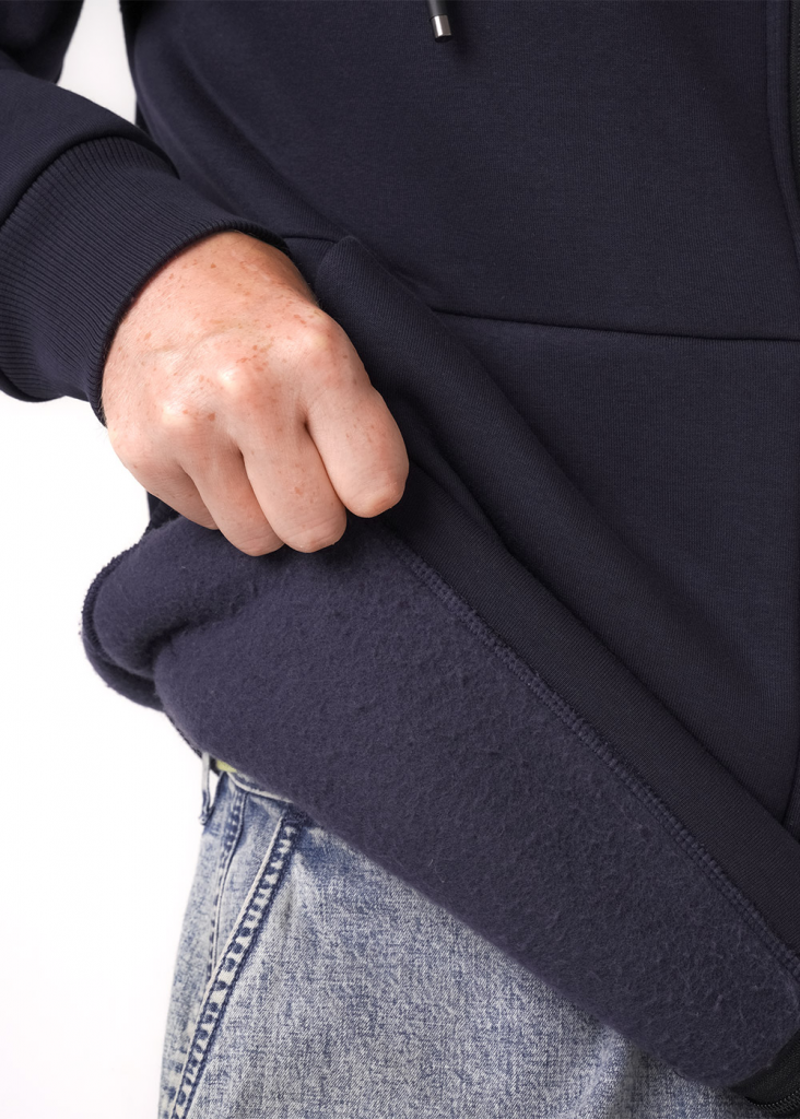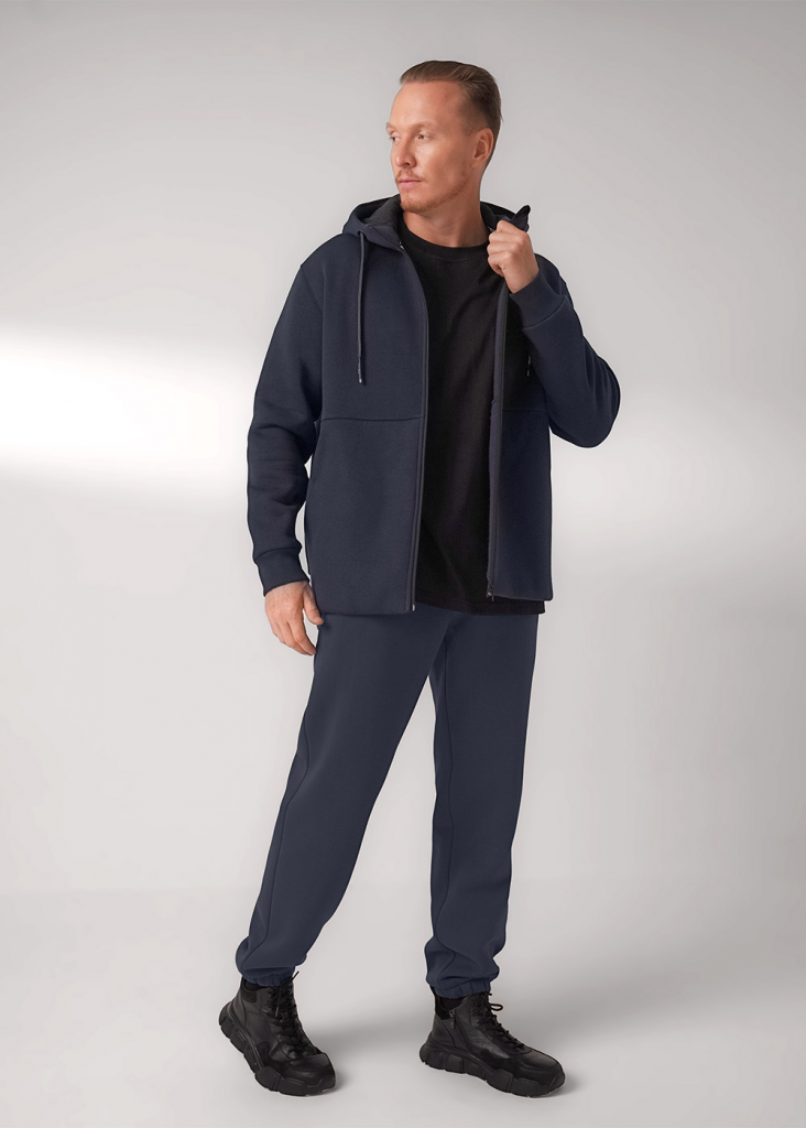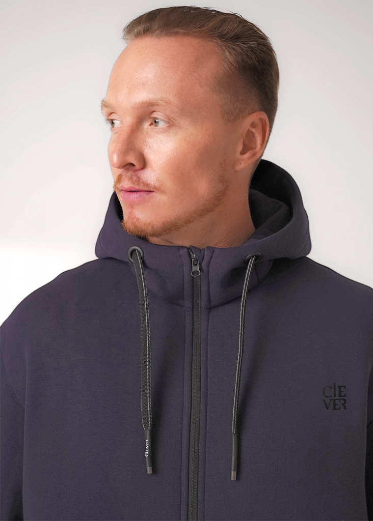Тёплая мужская трикотажная куртка на молнии с капюшоном и вместительными карманами. Произведена из мягкого трикотажного футер с начёсом, дополнена дизайнерским принтом. Удобный и практичный вариант на каждый день.
