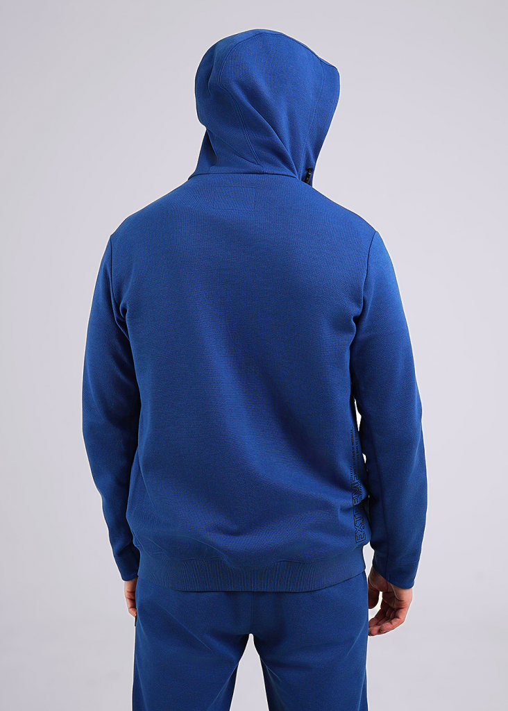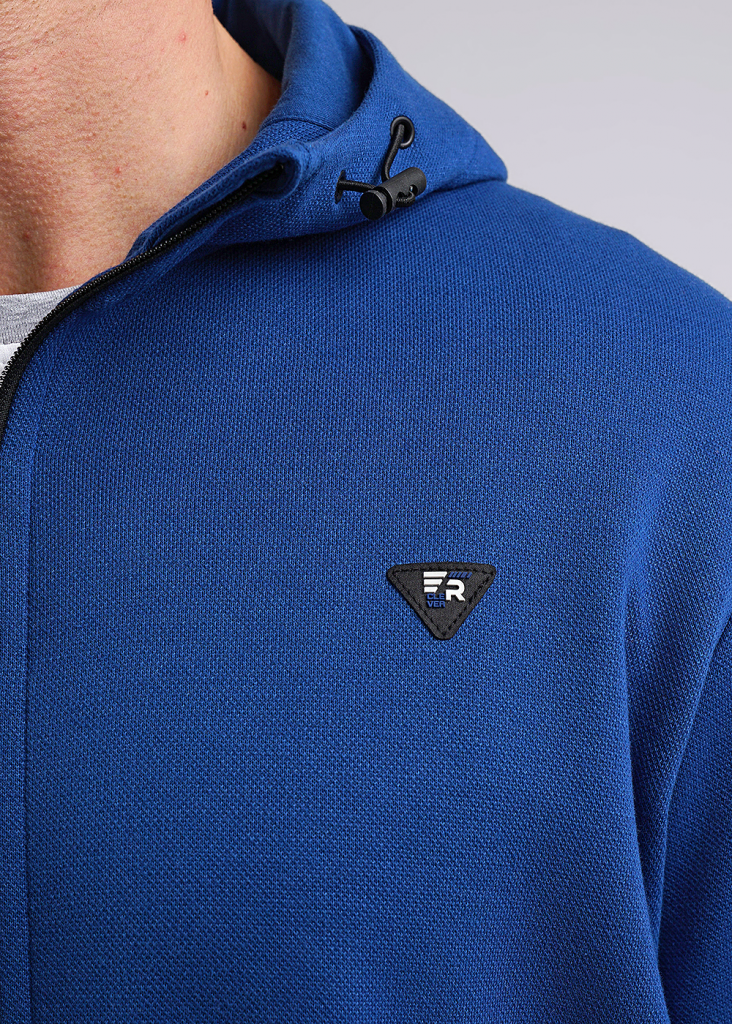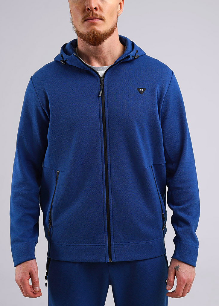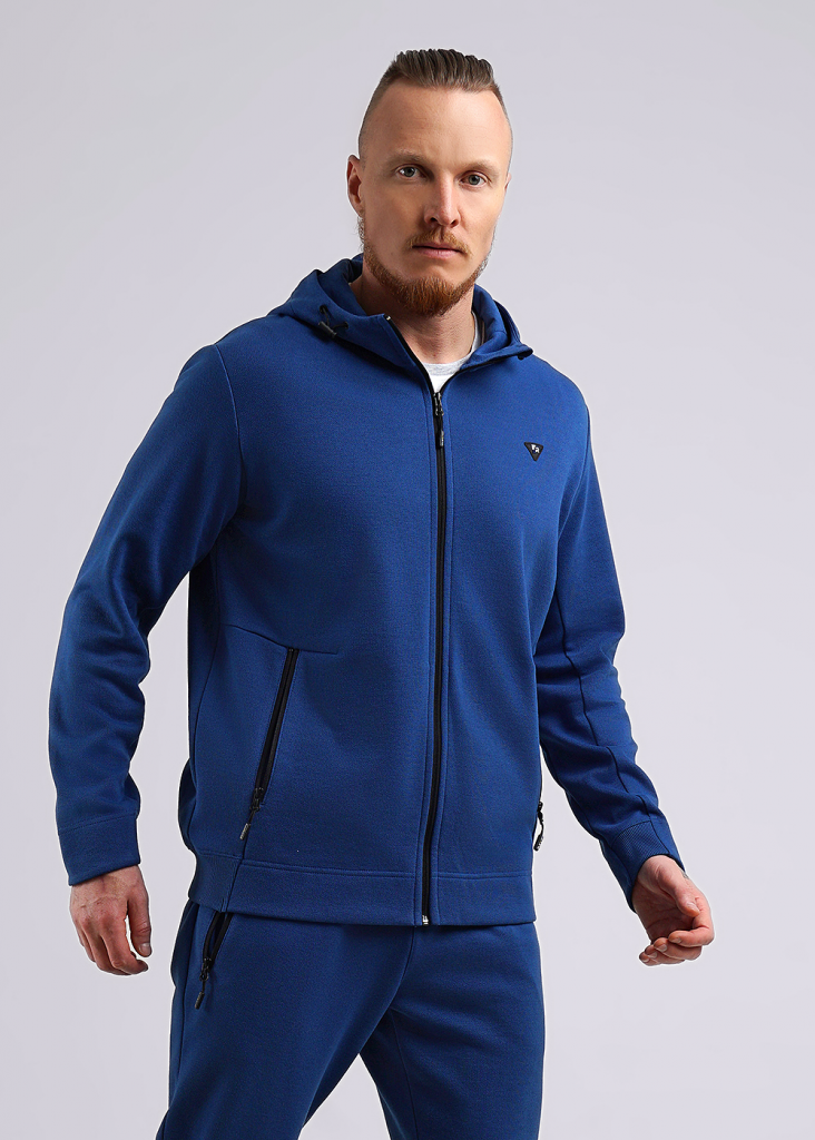 Мужская куртка на молнии из трикотажного полотна с капюшоном на подкладе. По капюшону резинка со стопором, спереди удобные наклонные карманы. Куртка на поясе и с манжетами. Дополнена фирменной фурнирурой.