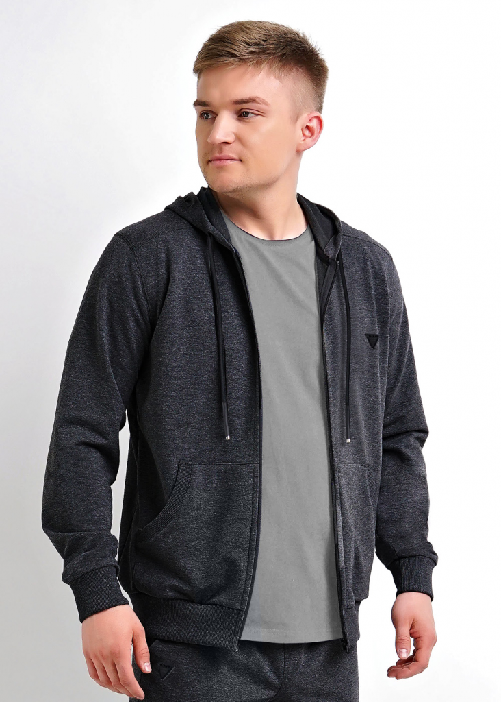 Модная куртка с капюшоном на молнии из плотного трикотажного полотна будет незаменимой вещью в гардеробе любого мужчины, благодаря функциональным карманам "кенгуру" и стильной отделке в виде нашивок.