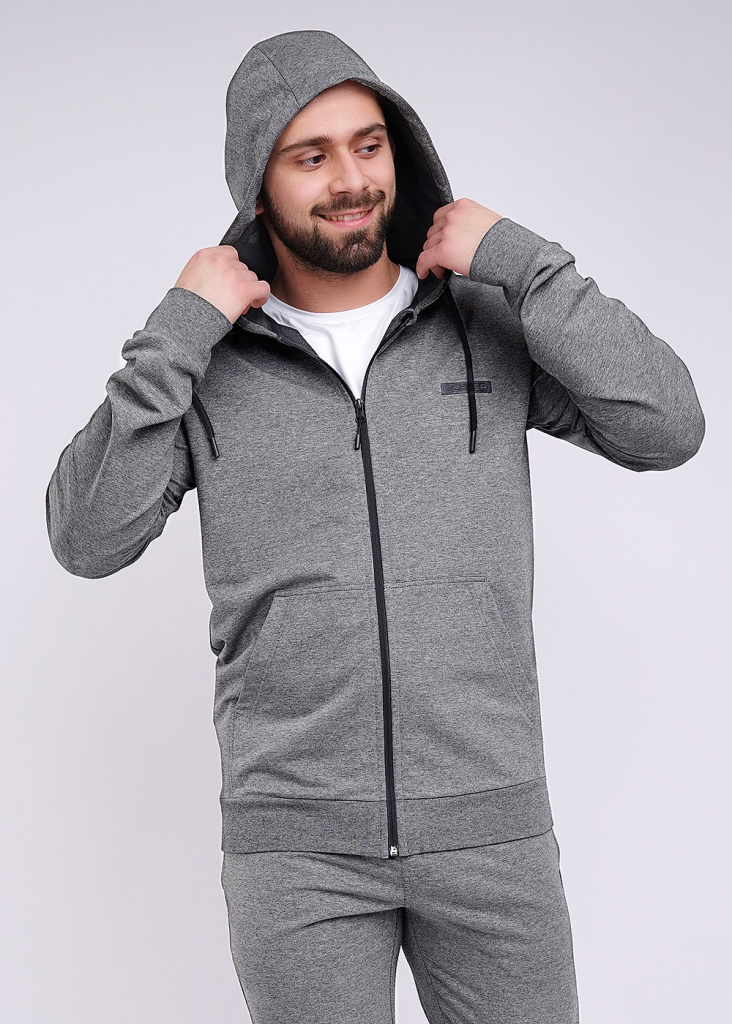 Модная куртка с капюшоном на молнии из плотного трикотажного полотна будет незаменимой вещью в гардеробе любого мужчины, благодаря функциональным карманам "кенгуру" и стильной отделке в виде нашивок.