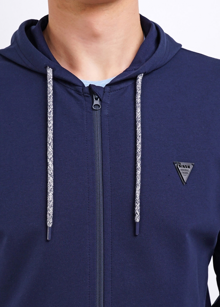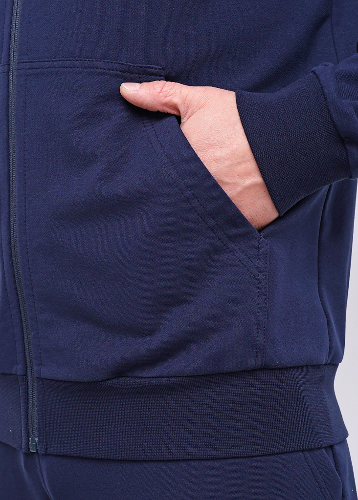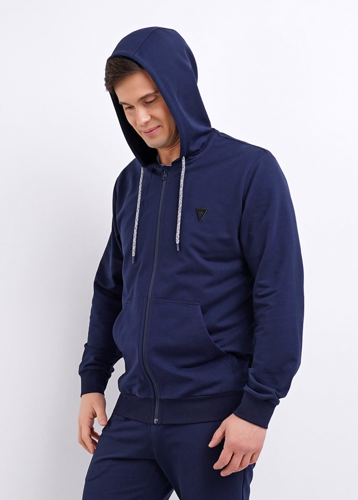 Модная куртка с капюшоном на молнии из плотного трикотажного полотна будет незаменимой вещью в гардеробе любого мужчины благодаря функциональным карманам "кенгуру" и стильной отделке изделия.
