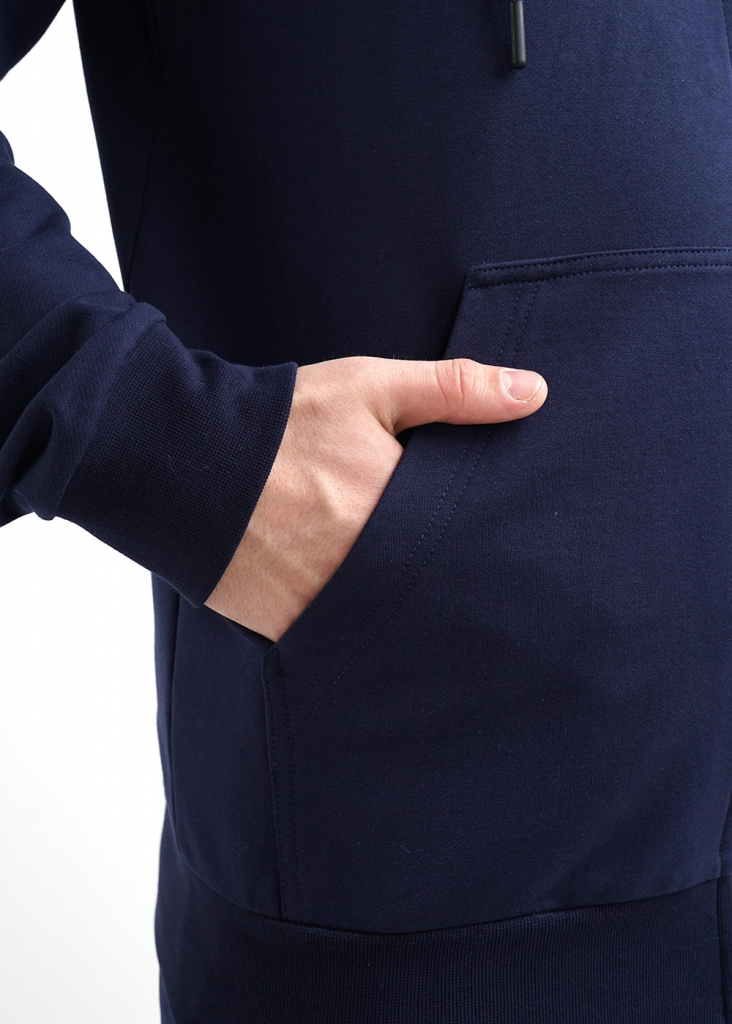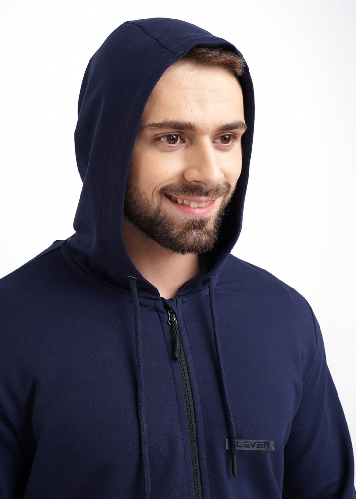 Толстовка с застежкой-молнией по переду на капюшоне из плотного трикотажа футера. Рукава втачные с манжетой, по низу пояс. На капюшоне люверсы со шнуром и наконечниками. Для функциональности и удобства спереди карман-кенгуру, для повседневной носки.