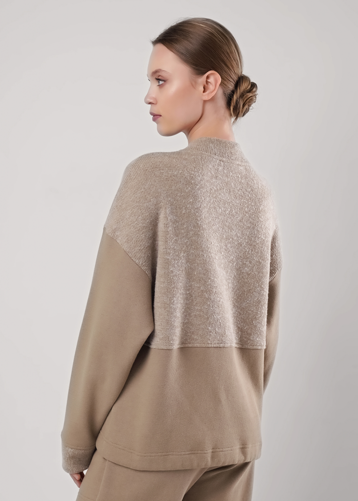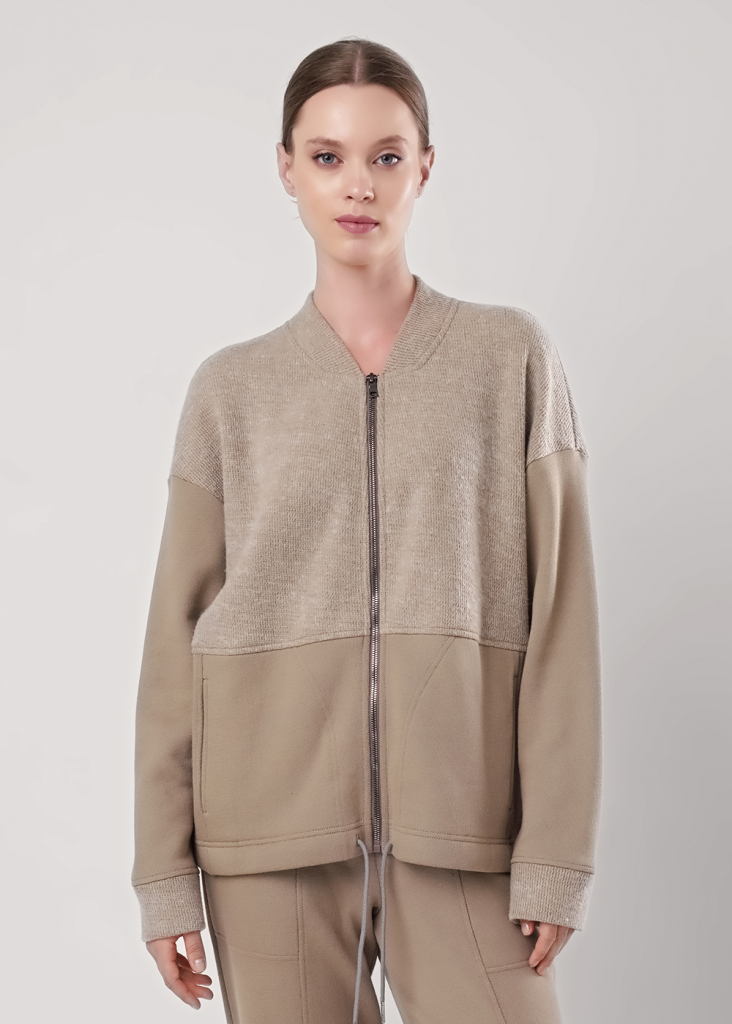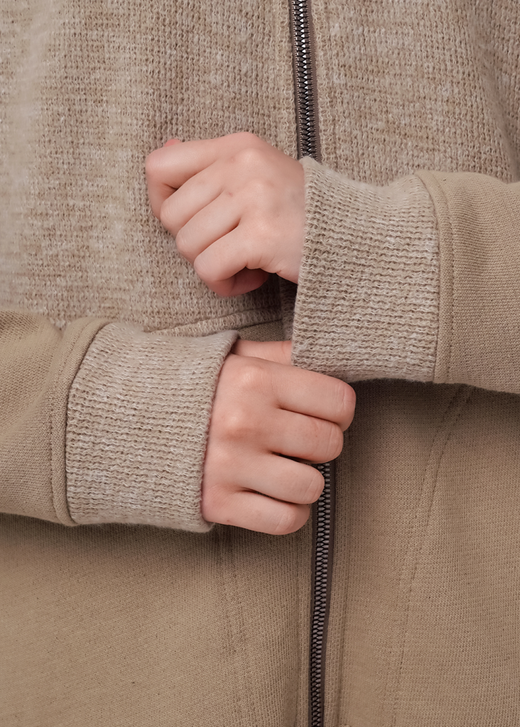 Куртка из трикотажного полотна вискоза вязанная,с застежкой на молнию.По переду, спинке кокетка (ворс).По горловине стойка.Длинный рукав со спущенной линией плеча, внизу манжет (ворс).По переду резы с карманами в швах. Внизу изделия шнур.Спереди вышивка.