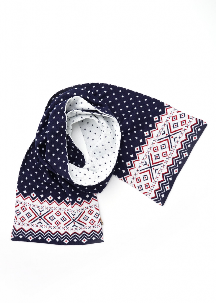 Универсальный тёмно-синий шарф со скандинавским рисунком. Подходит как для мужчин, так и для женщин. Можно комбинировать с шапкой в таком же стиле.