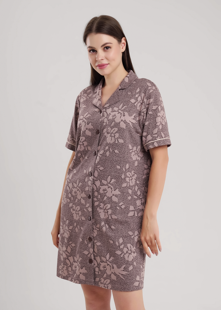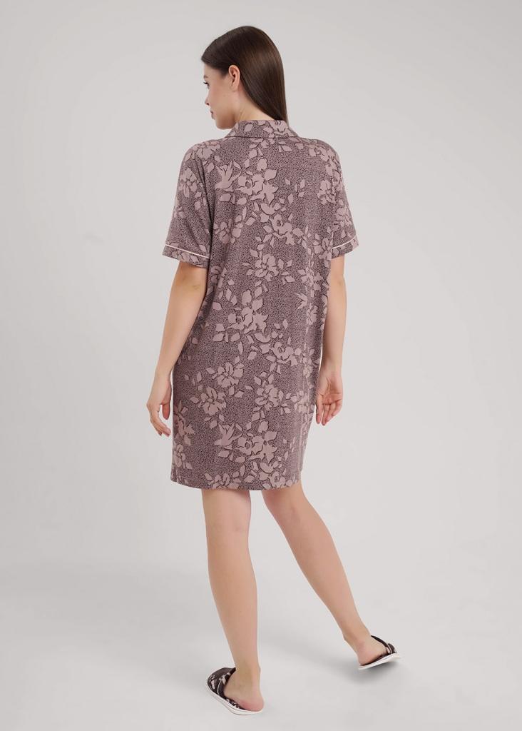 Платье для дома и отдыха из трикотажного полотна с добавлением модала, прямого силуэта с застежкой на пуговицы. Втачной короткий рукав, по низу рукава манжет с кантом. По горловине воротник с лацканами. Боковые карманы с окантовкой.