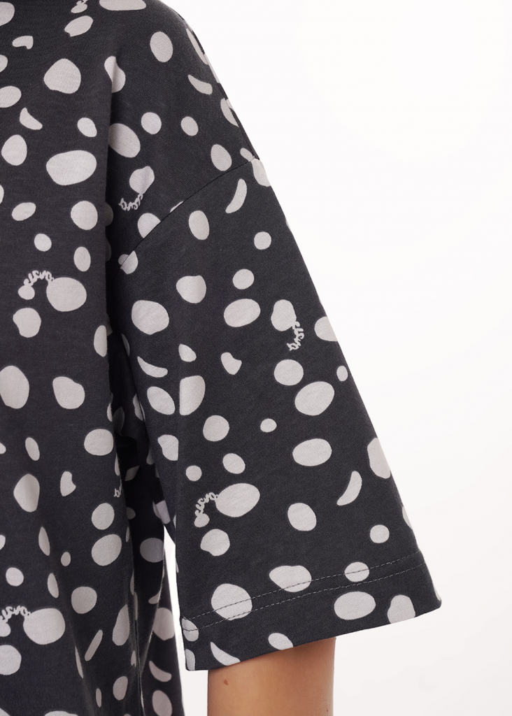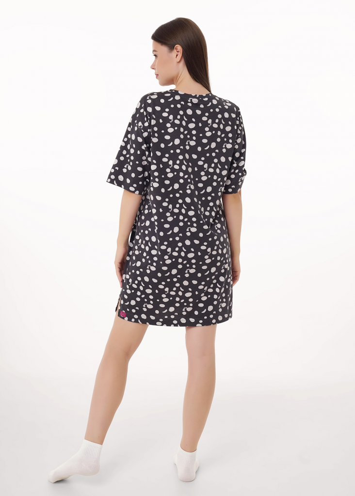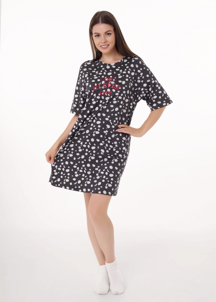 Платье для дома и отдыха из хлопкового трикотажного полотна прямого кроя. Округлая горловина с обтачкой. Короткий втачной рукав. Спереди принт фольга, накладной карман. Боковые разрезы,сзади по низу нашивка.