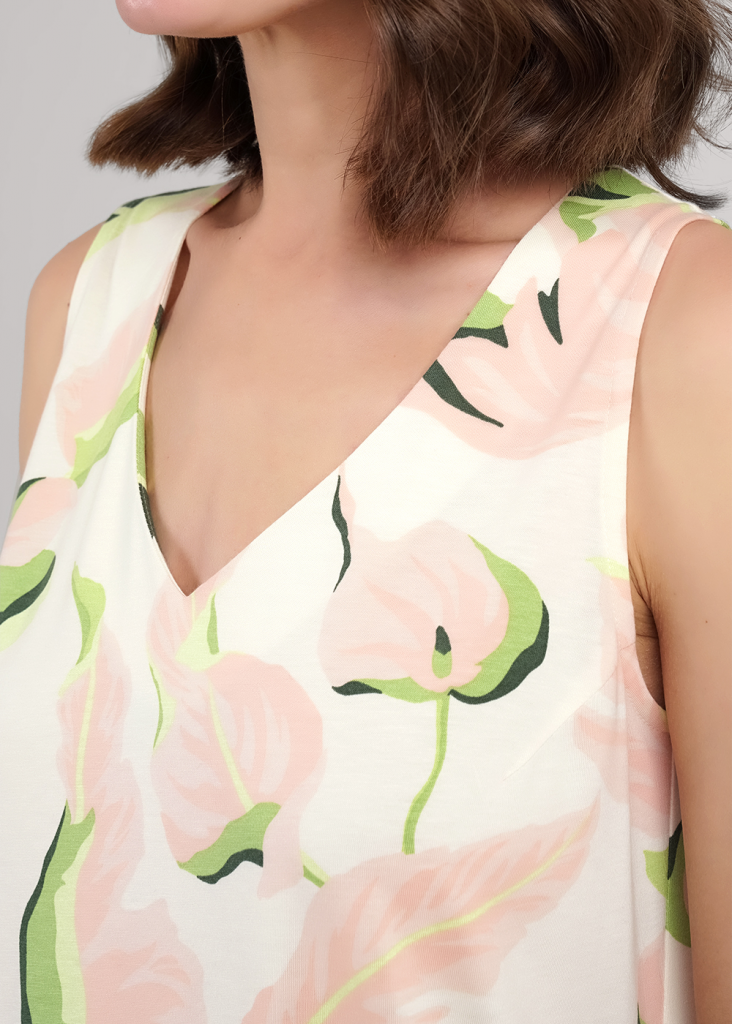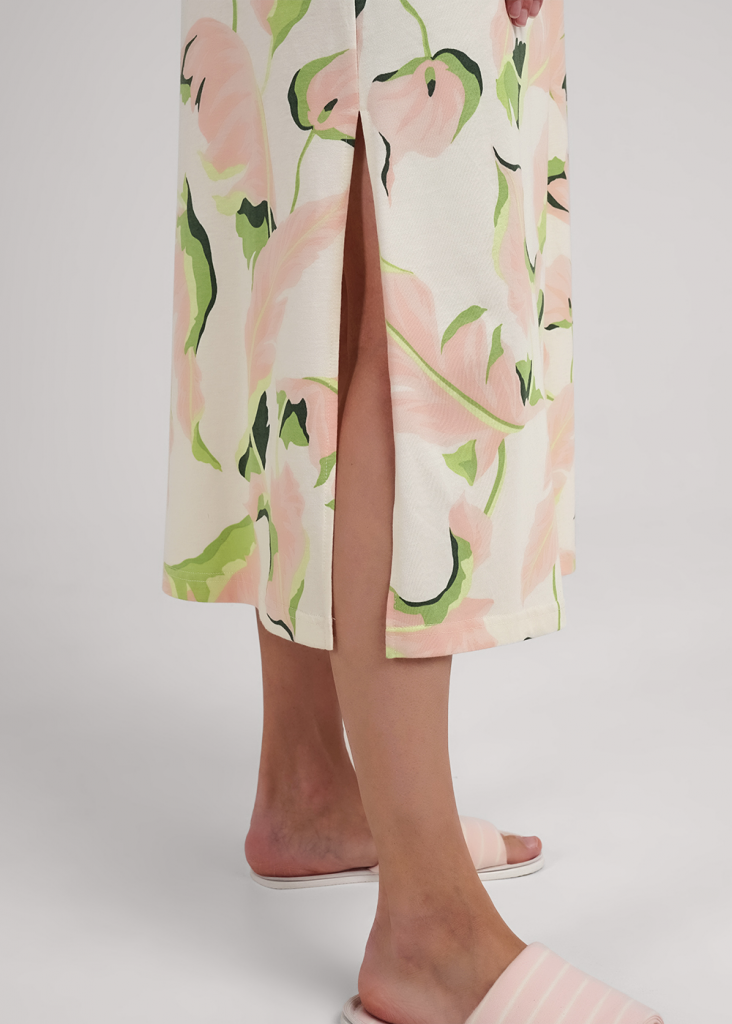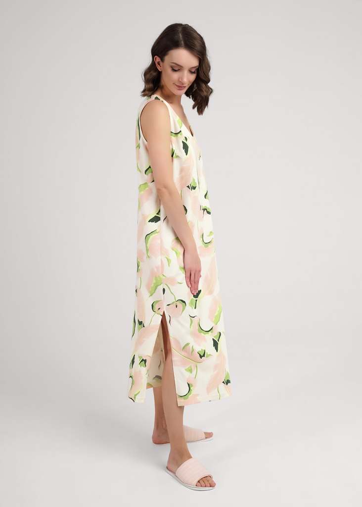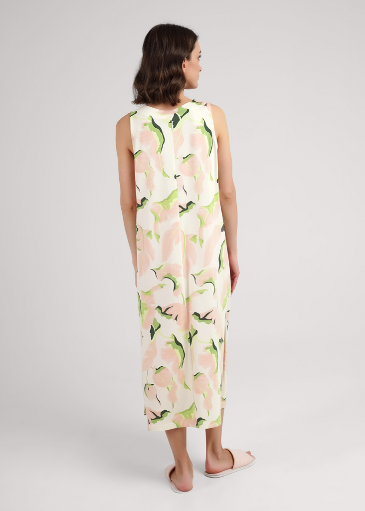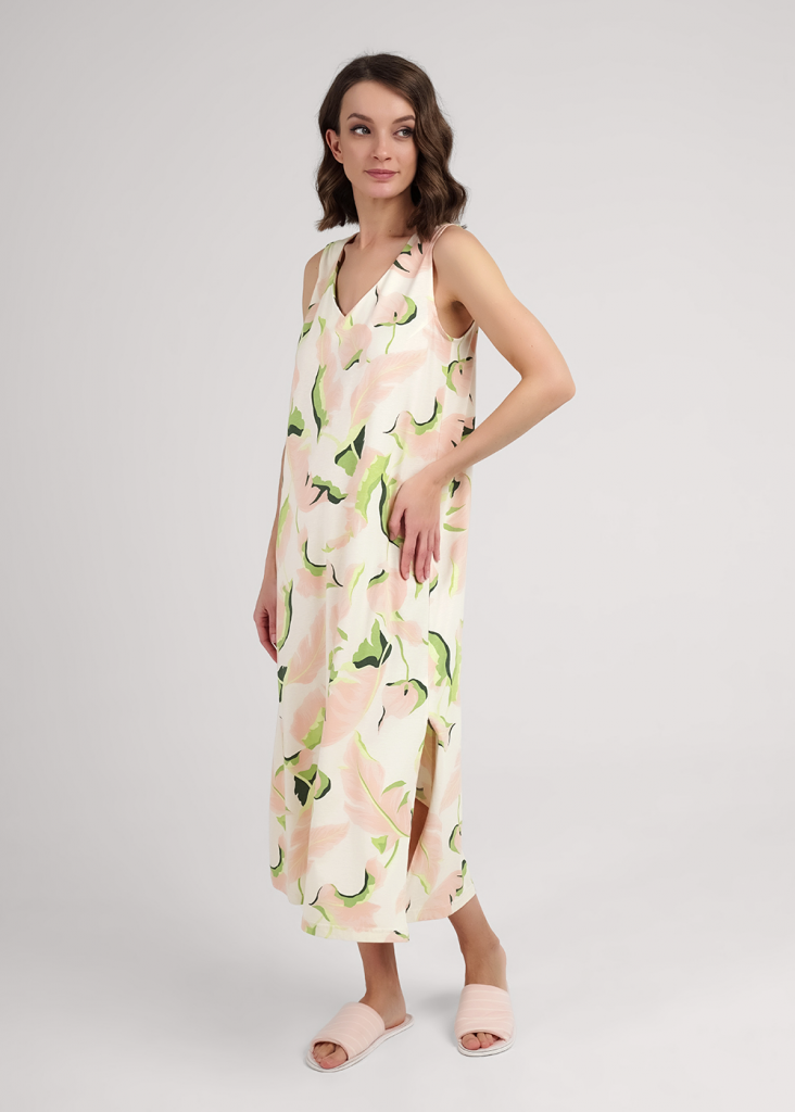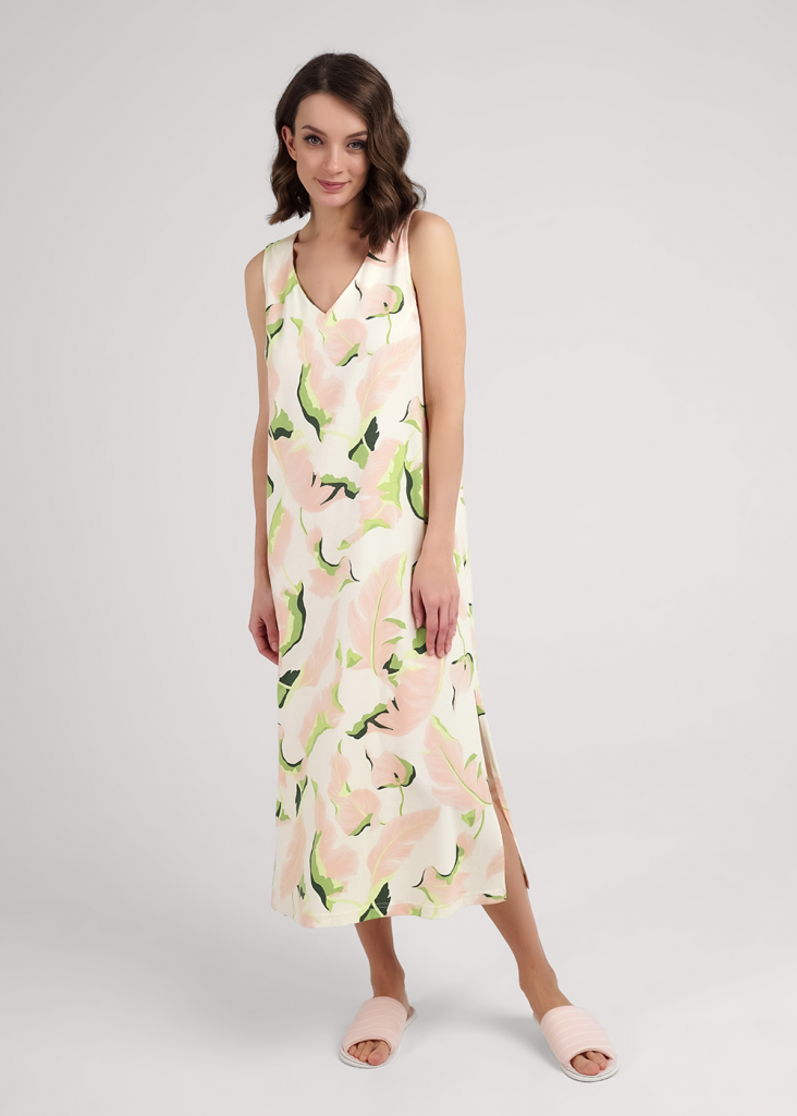 Платье для дома и отдыха, длинное из хлопкового трикотажного полотна с добавлением модала. Без рукавов слегка расклешенное книзу. V-образный вырез горловины с обтачкой, по пройме внутренняя окантовка. По бокам разрезы.