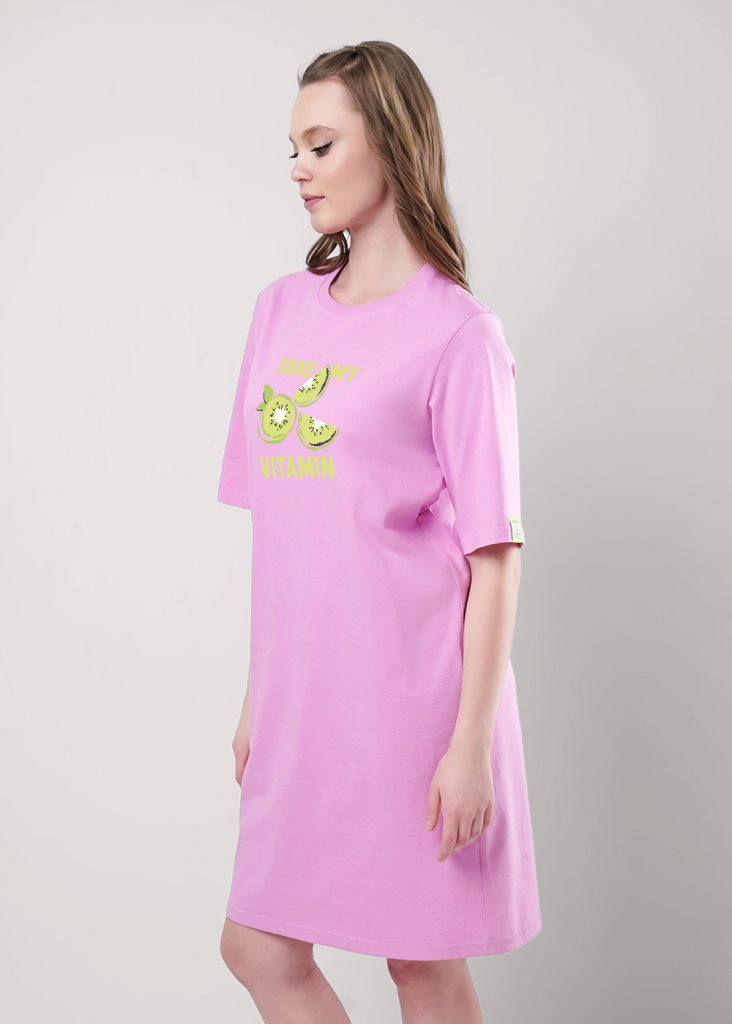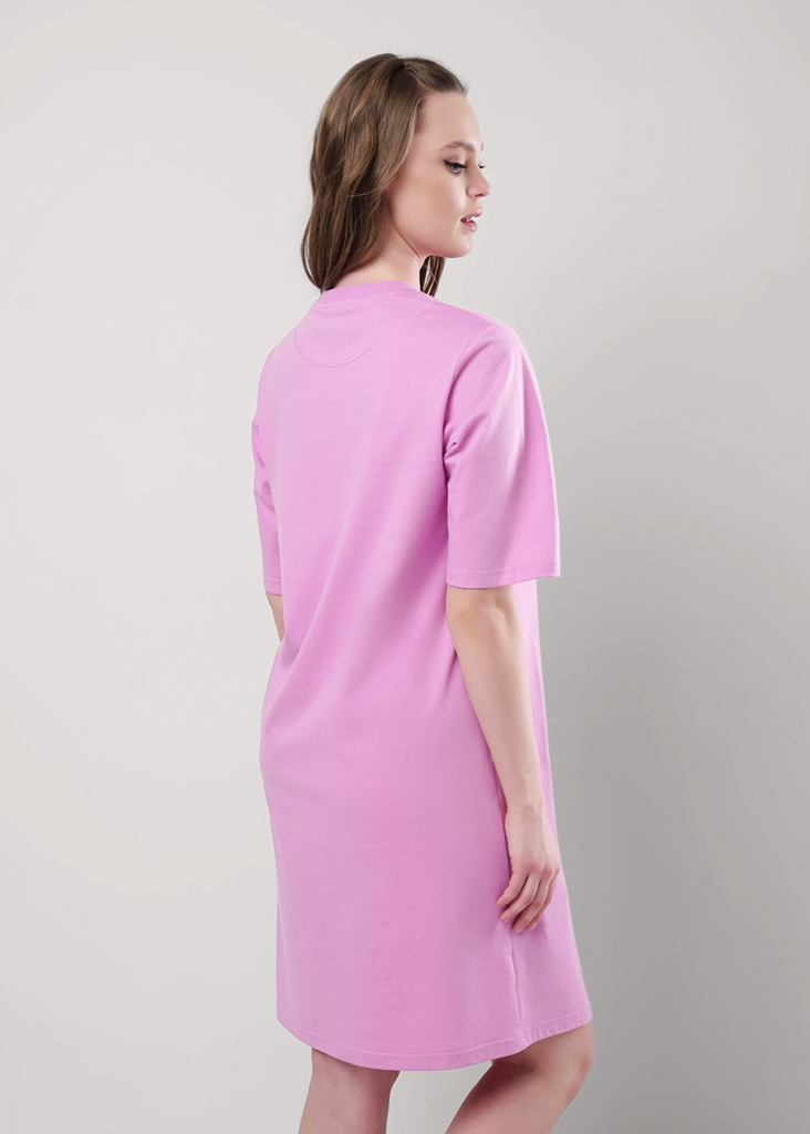 Платье для дома прямого кроя из хлопкового трикотажного полотна. Округлая горловина с обтачкой из кашкорсе. Короткий втачной рукав, нашивка. Спереди принт. Сзади по спинке внутренняя кокета, застил.