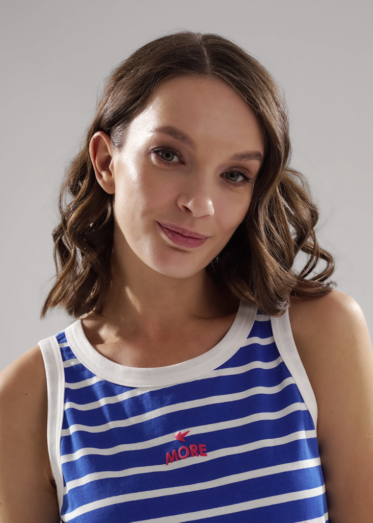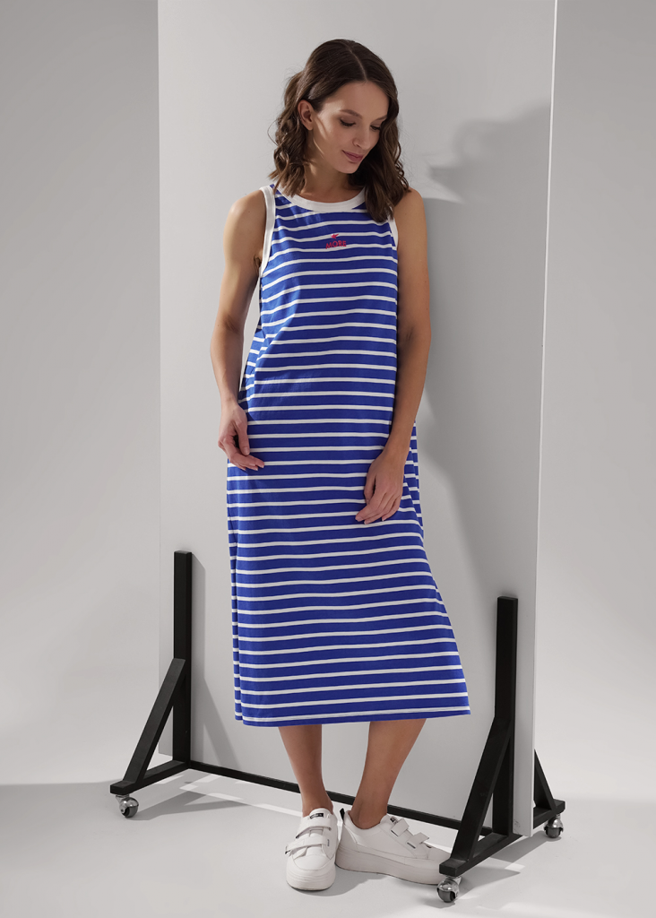 Платье для дома и отдыха прямого силуэта из хлопкового трикотажного полотна, без рукавов среднее плечо. По горловине и пройме окантовка. Спереди принт вспенка, боковые разрезы.