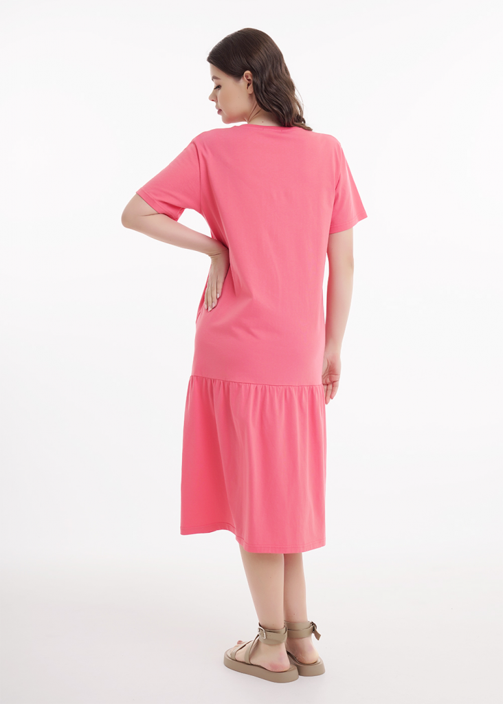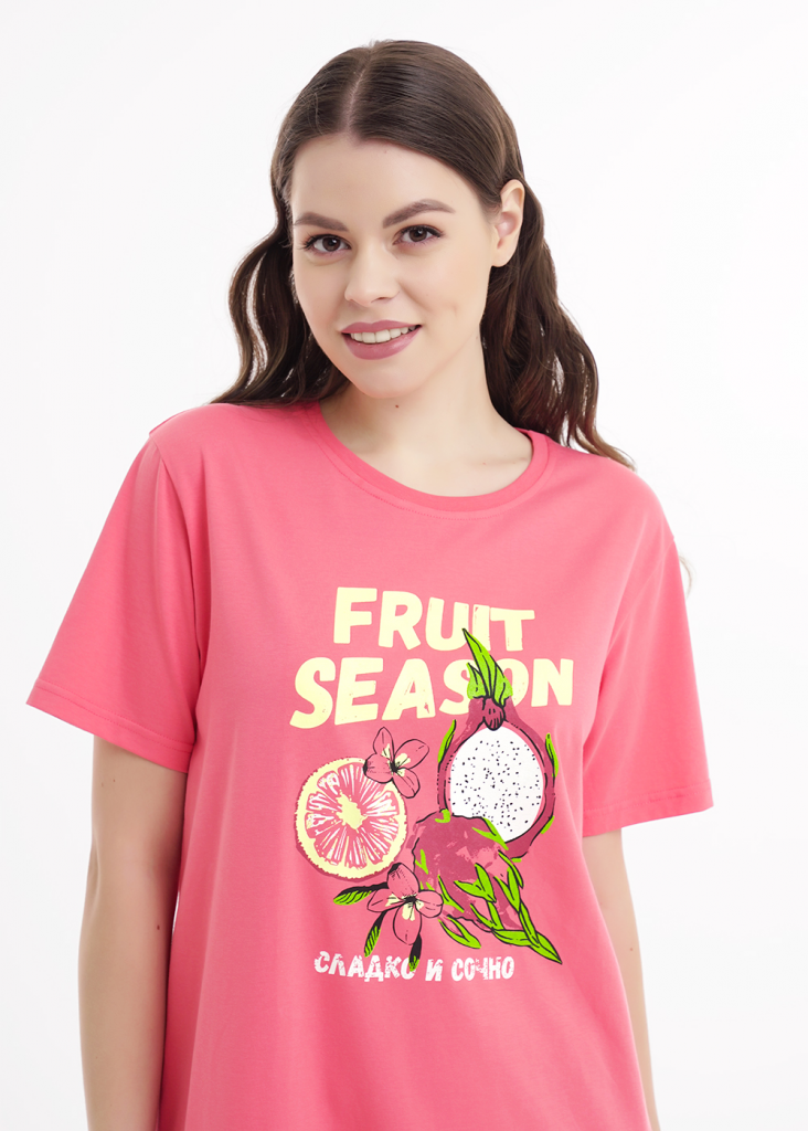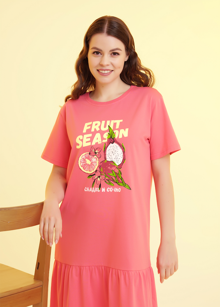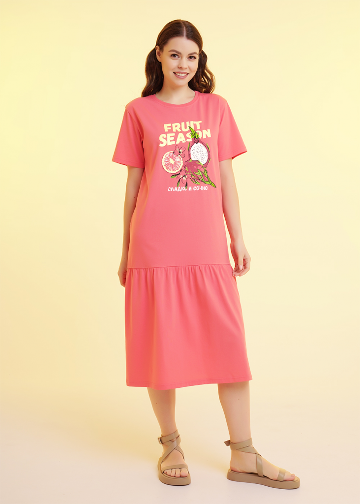 Платье для дома и отдыха из хлопкового трикотажного полотна,прямого силуэта. Втачной короткий рукав, внизу термонаклейка силикон. Округлая горловина с обтачкой. По низу изделия отрезная юбка, собрана на сборку. Спереди принт,вышивка.