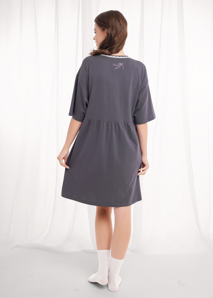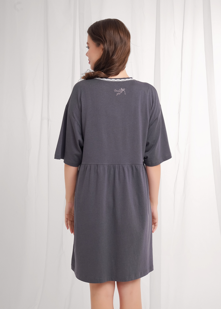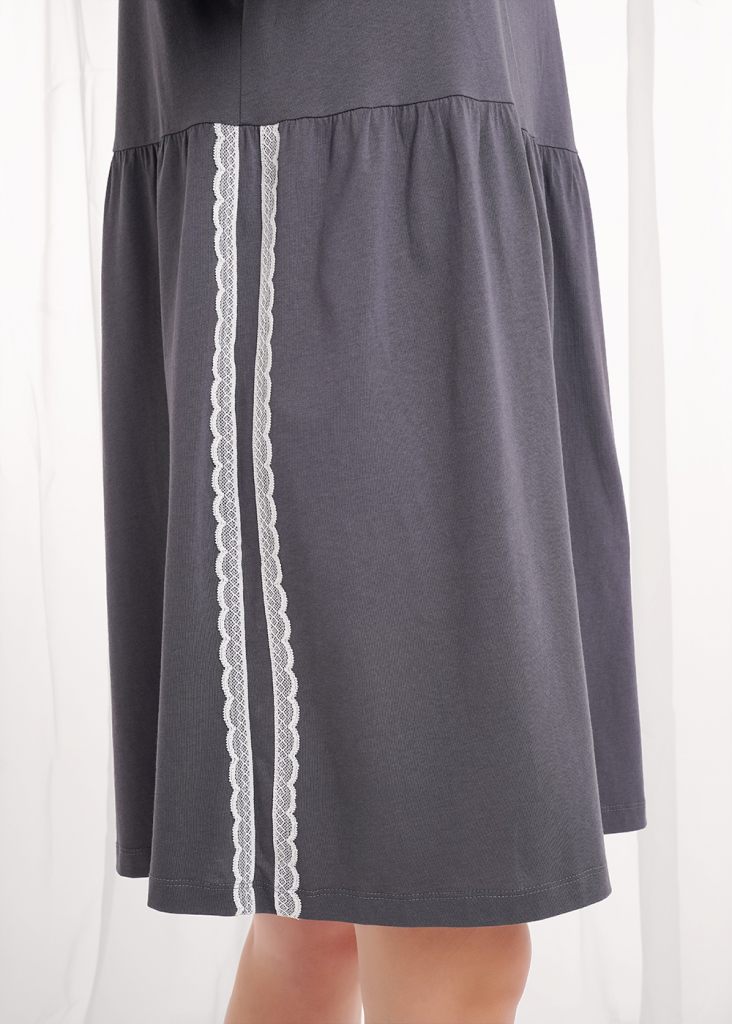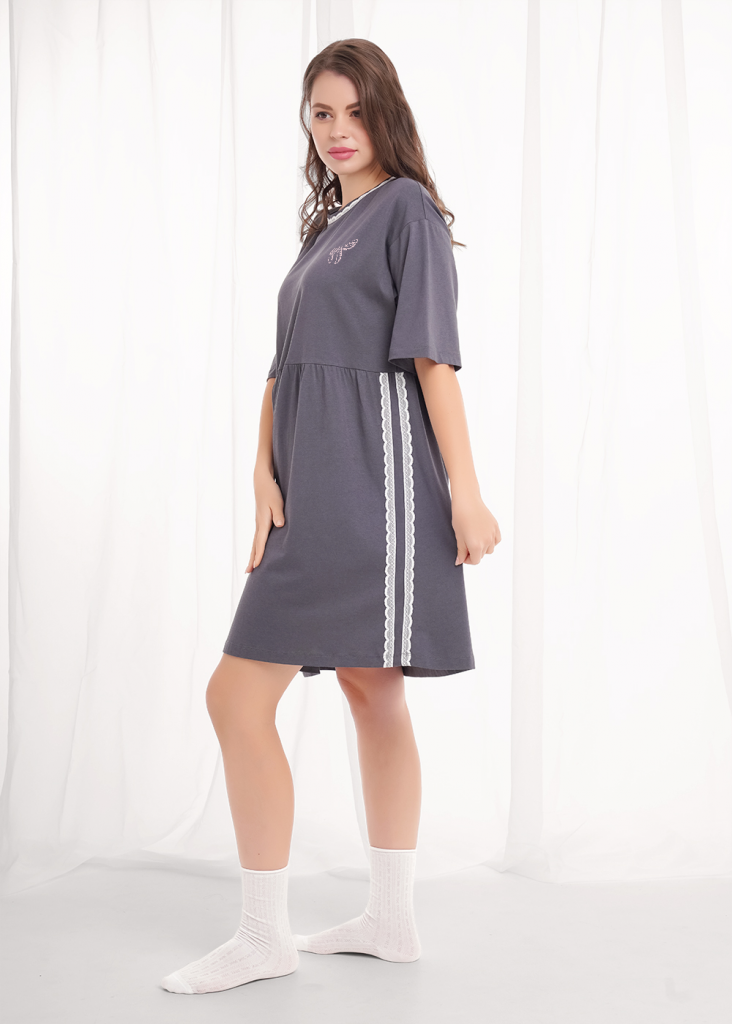 Платье свободного силуэта из хлопкового трикотажного полотна с добавлением модала. Короткий слегка спущенный рукав. По горловине обтачка с кружевом. По талии рез с присборенной юбкой. По бокам узкое кружево 2 ряда. Спереди нашивка, сзади принт.