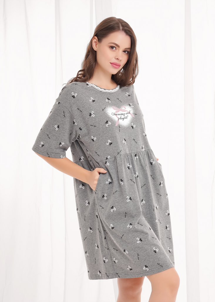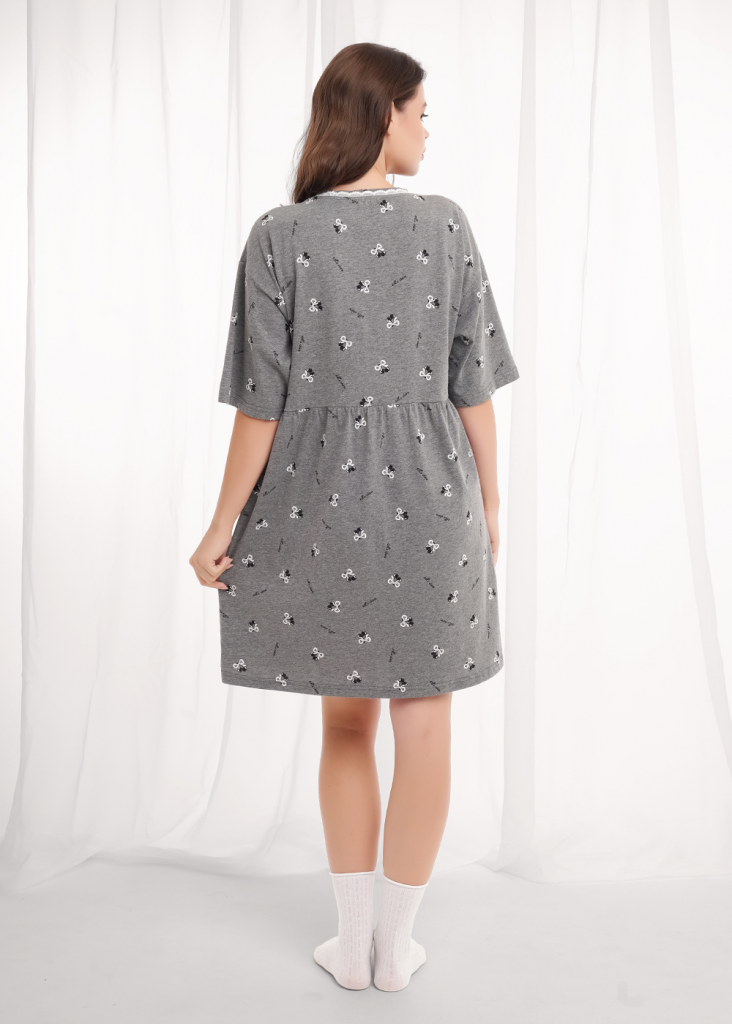 Платье свободного силуэта из хлопкового трикотажного полотна, длиной ниже колена. Короткий слегка спущенный рукав. По горловине обтачка с кружевом. По талии рез с присборенной юбкой. Боковые карманы с отрезным бочком. Спереди принт.