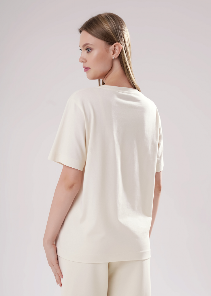 Футболка прямого силуэта из хлопкового трикотажного полотна. Короткий втачной рукав. Округлая горловина с обтачкой. Спереди принт.
