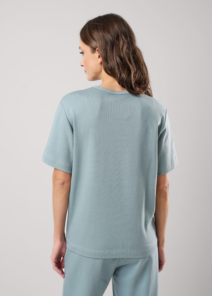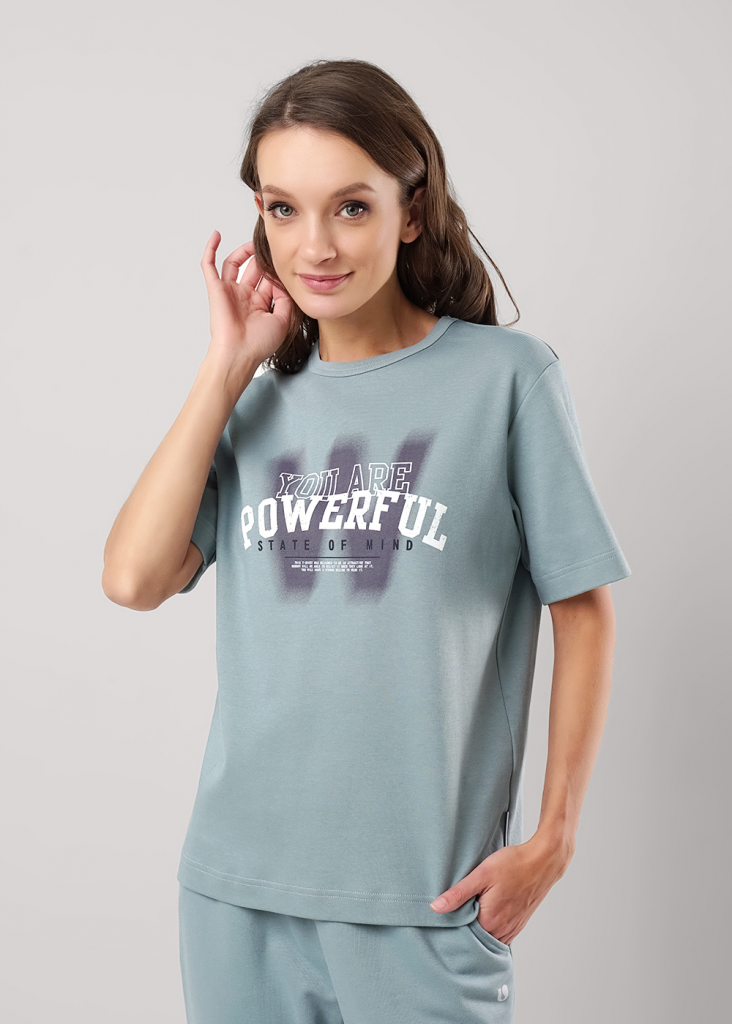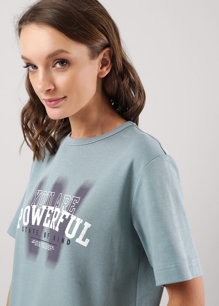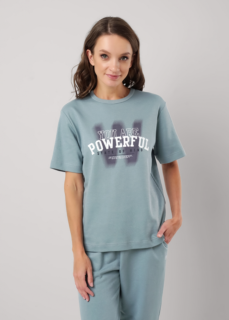 Футболка прямого силуэта из плотного хлопкового трикотажного полотна интерлок. Втачной короткий рукав. Округлая горловина с обтачкой. Сбоку вшивка,спереди принт.