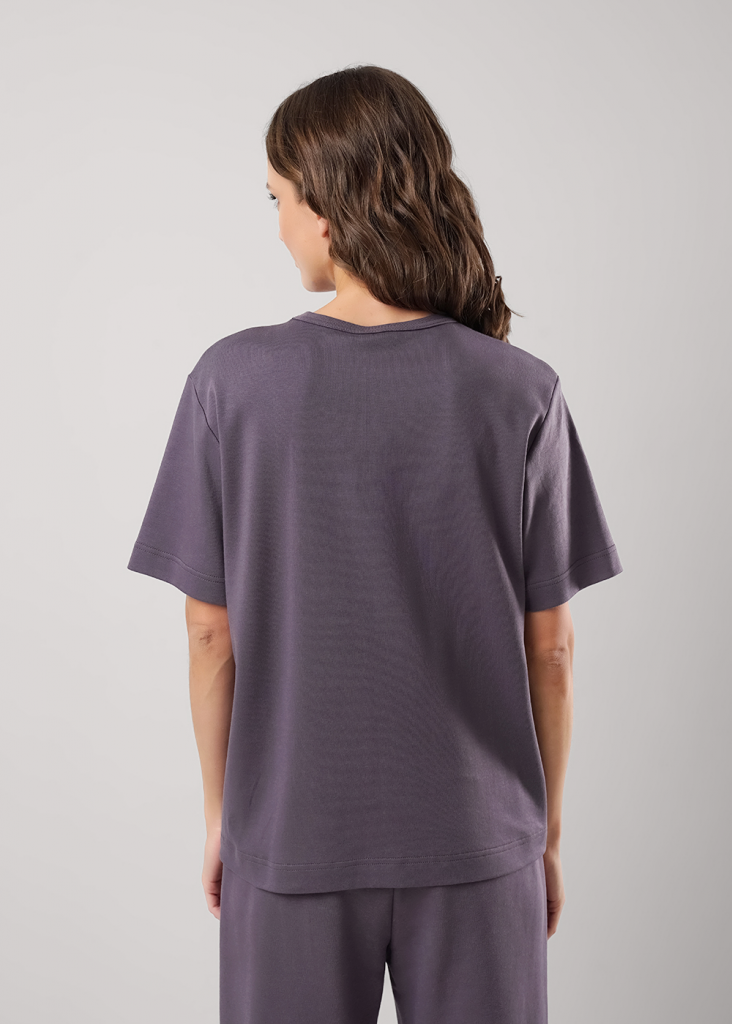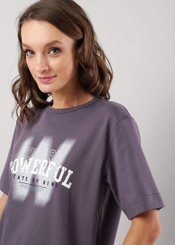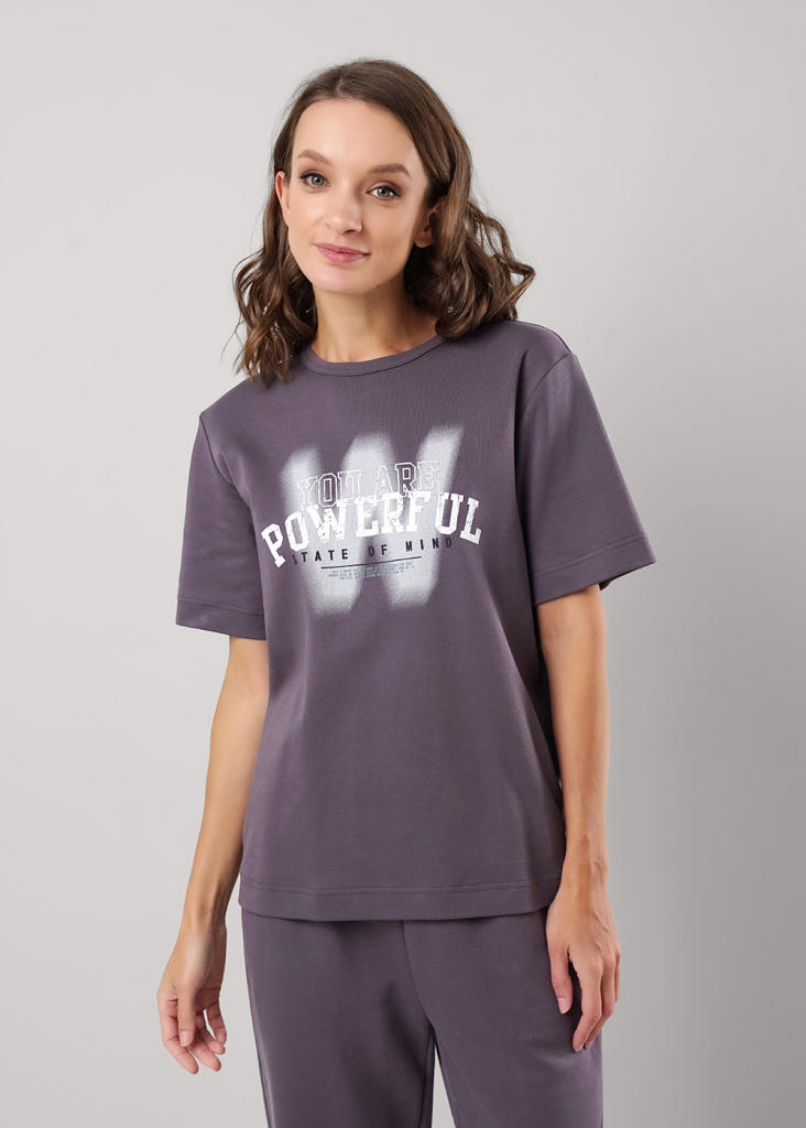 Футболка прямого силуэта из плотного хлопкового трикотажного полотна интерлок. Втачной короткий рукав. Округлая горловина с обтачкой. Сбоку вшивка,спереди принт.