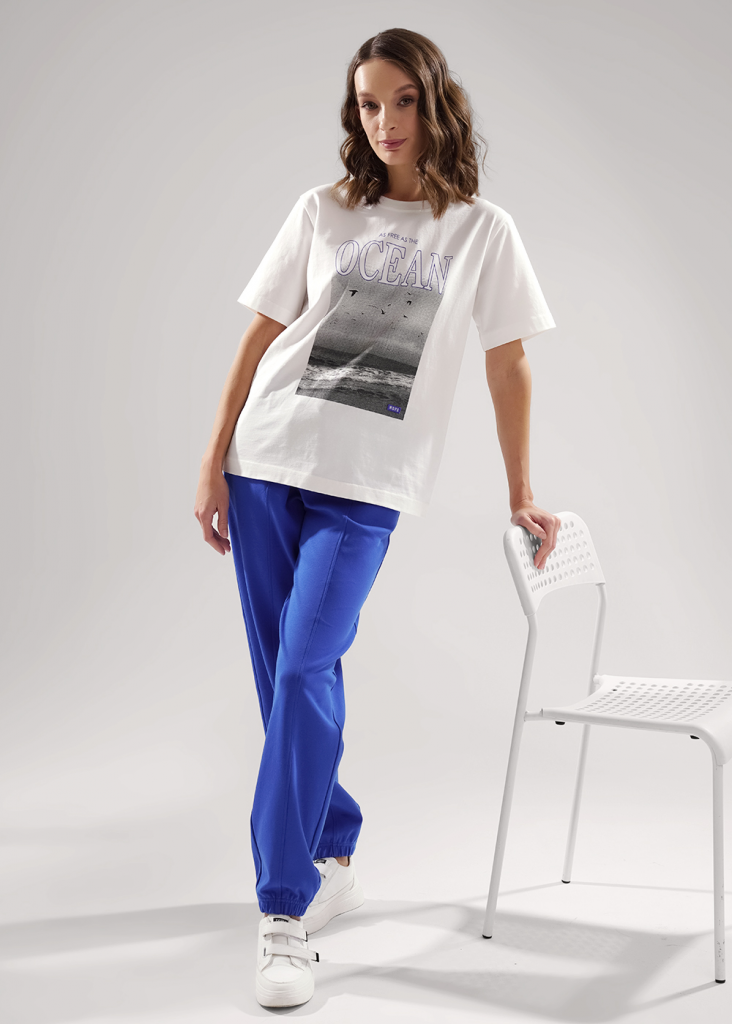 Футболка для дома и отдыха прямого силуэта из хлопкового трикотажного полотна. Округлая горловина с обтачкой из рибаны. Короткий втачной рукав. На детали переда принт, нашивка.