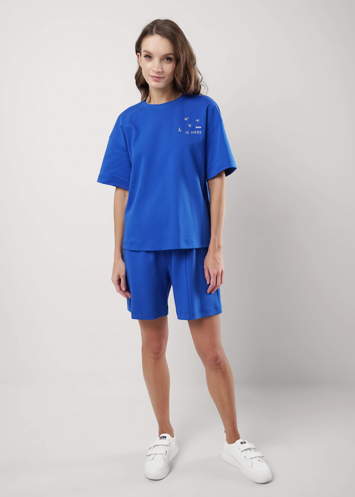 Футболка для дома и отдыха прямого силуэта из хлопкового трикотажного полотна интерлок. Округлая горловина с обтачкой из кашкорсе. Короткий рукав со спущенной линией плеча. На детали переда принт, нашивка.