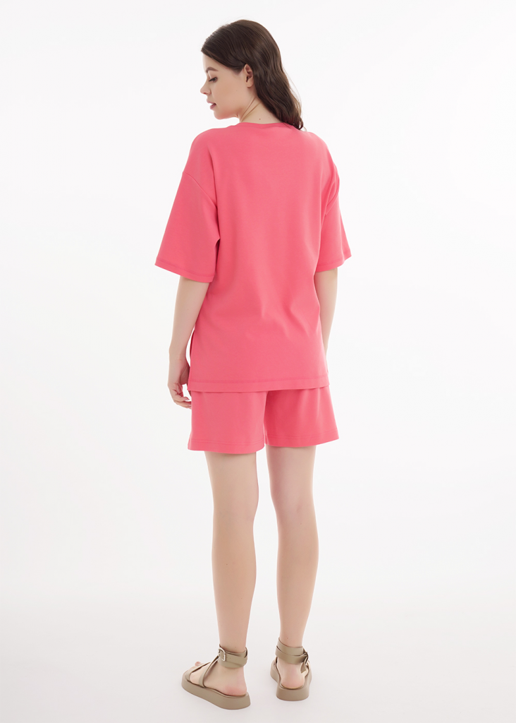 Футболка для дома и отдыха из трикотажного полотна интерлок прямого кроя. Округлая горловина с обтачкой. По горловине, низу рукава и изделия застилы. Короткий рукав со спущенный линией плеча. Спереди и по рукаву принт. По бокам разрезы.