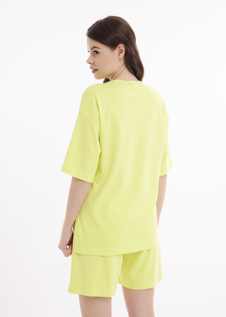 Футболка для дома и отдыха из трикотажного полотна интерлок прямого кроя. Округлая горловина с обтачкой. По горловине, низу рукава и изделия застилы. Короткий рукав со спущенный линией плеча. Спереди и по рукаву принт. По бокам разрезы.