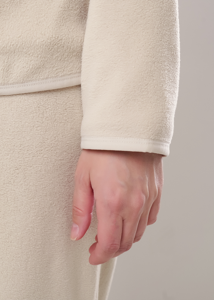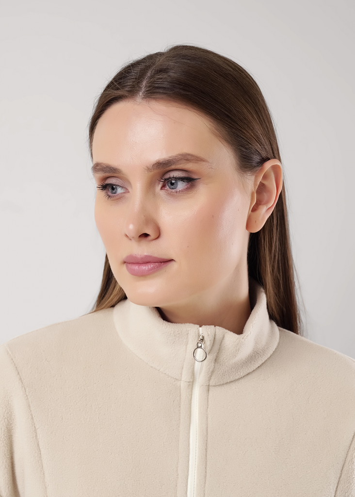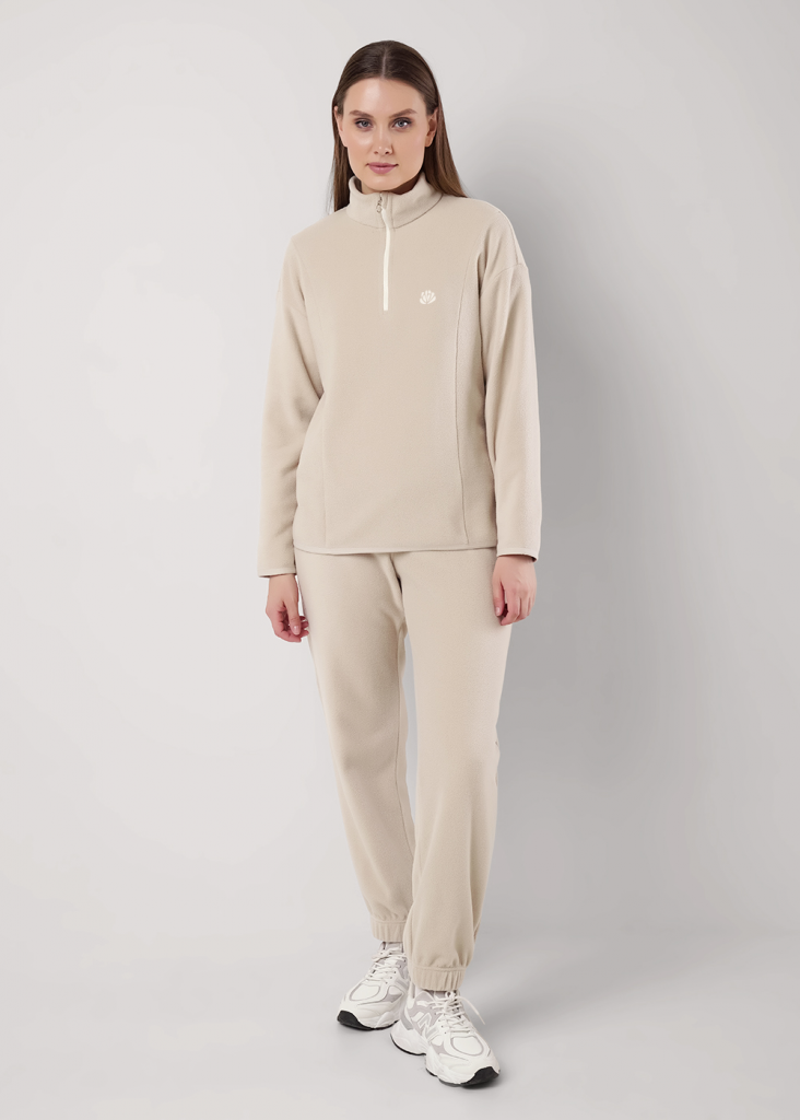 Джемпер спортивный прямого силуэта из трикотажного полотна флис. По горловине стойка с молнией. Спереди рельефы. Длинный рукав со спущенной линией плеча. По низу рукава и низа изделия окантовка. Спереди вышивка.