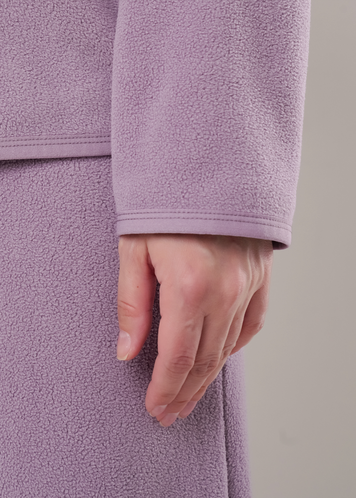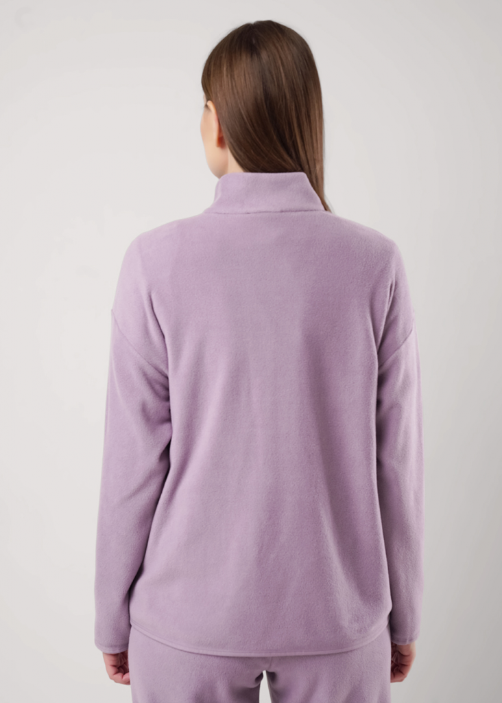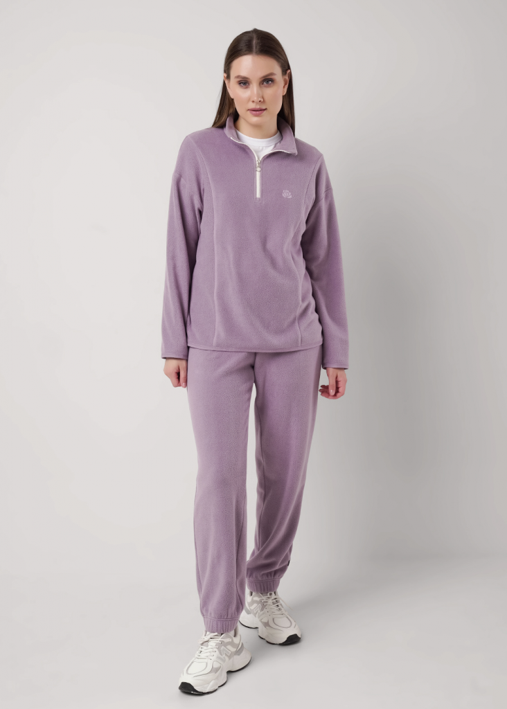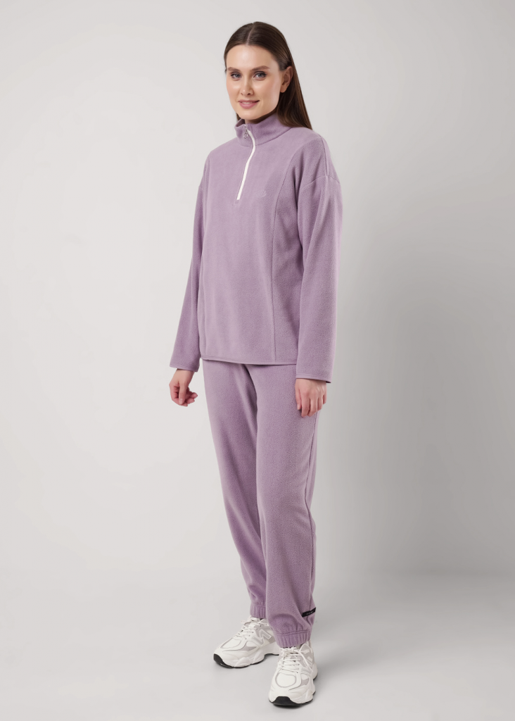 Джемпер спортивный прямого силуэта из трикотажного полотна флис. По горловине стойка с молнией. Спереди рельефы. Длинный рукав со спущенной линией плеча. По низу рукава и низа изделия окантовка. Спереди вышивка.